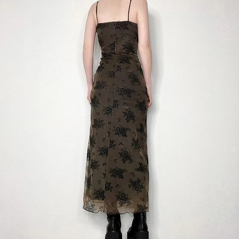 Goth Dark Fashion Flocking Florals Print Straps Long Dress Mall Gothic V-neck Bandage Bodycon Dresses Women Mesh Sheer Partywear