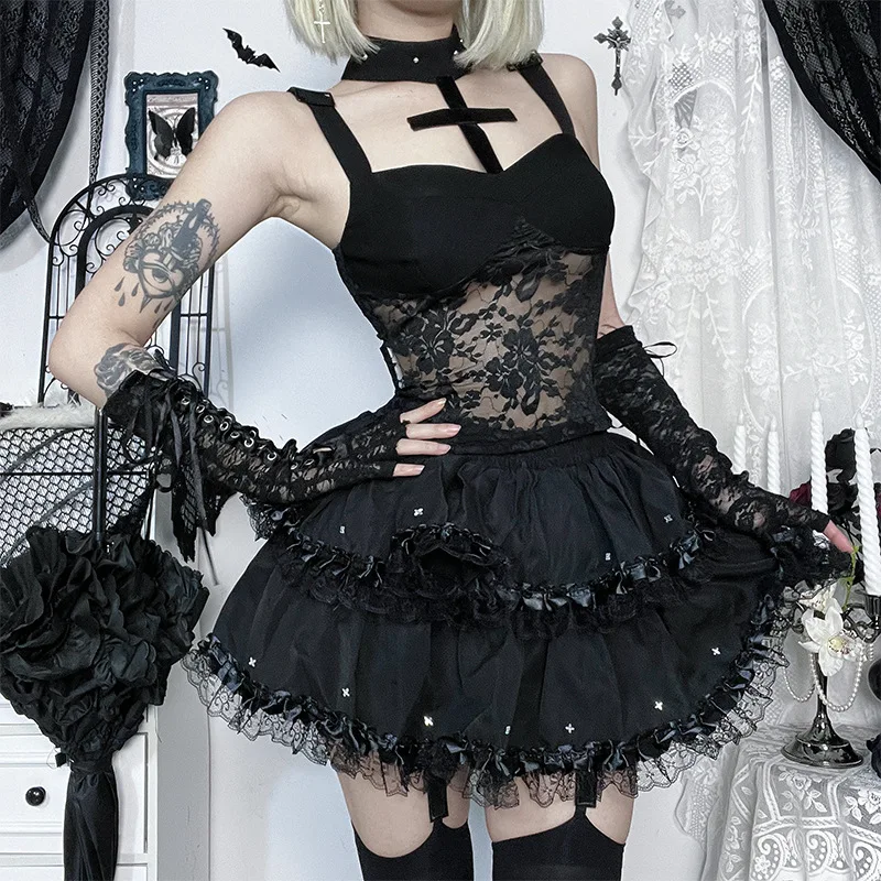 Goth Dark Mall Gothic Fashion Lace Patchwork See Through Tank Top Y2K Grunge Cross Halter Tops Punk Slim Straps Crop Vests Women