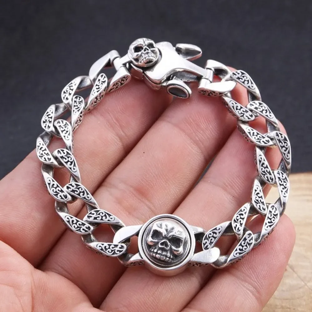 BOCAI New S925 Pure Silver Men’s Bracelet Real Solid Punk Skull Head Design Simple Couple Bracelet for Parties
