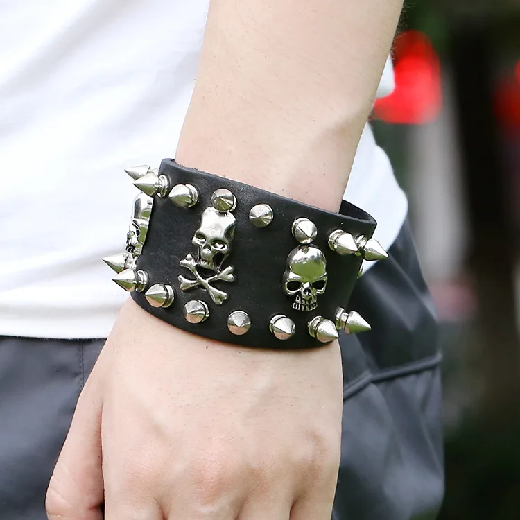 Wholesale Punk Skeleton Bracelet for Men Metal Rivet Studs Personality Genuine Leather Bracelets Bangles