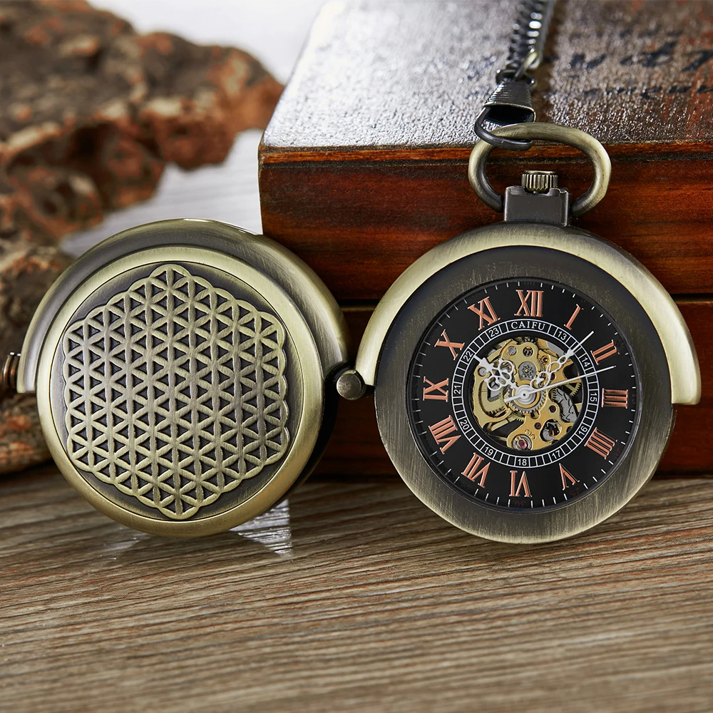Steampunk Mechanical Hand Wind Pocket Watch Man Hollow Retro Bronze Cover Double Turntable Capping Pendant Necklace Reloj Honbre