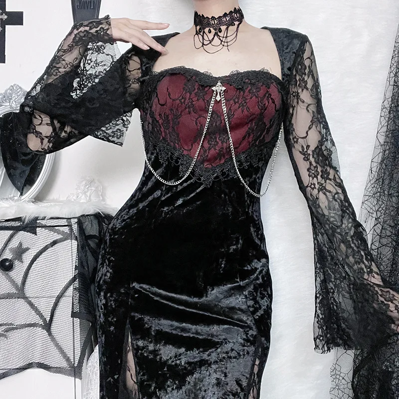 Gothic Women Evening Dresses Grunge Aesthetic Dark Wind Dress Lace Splice Sexy Split Alt Outfits