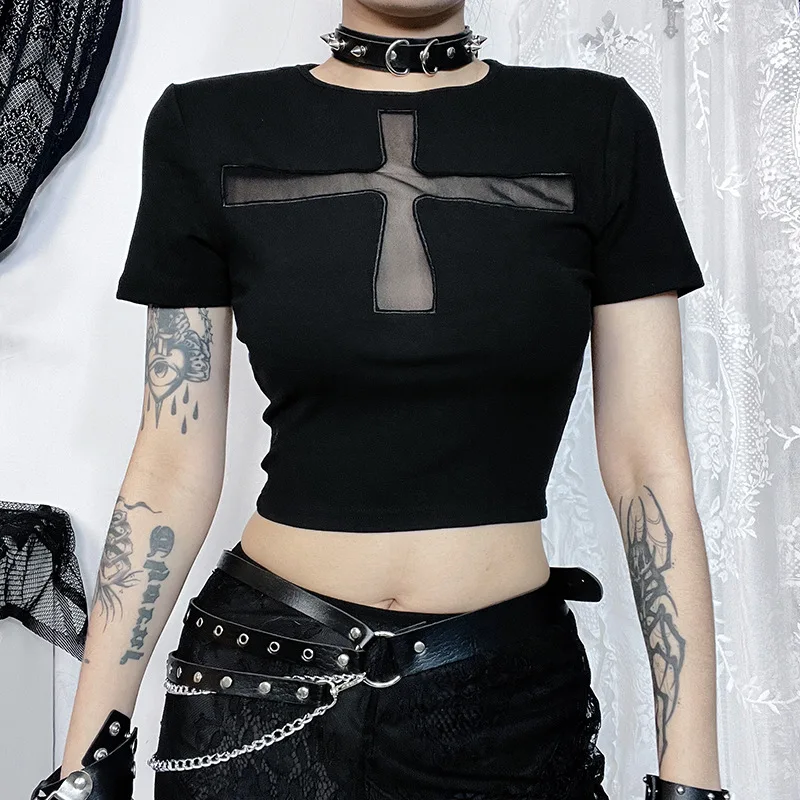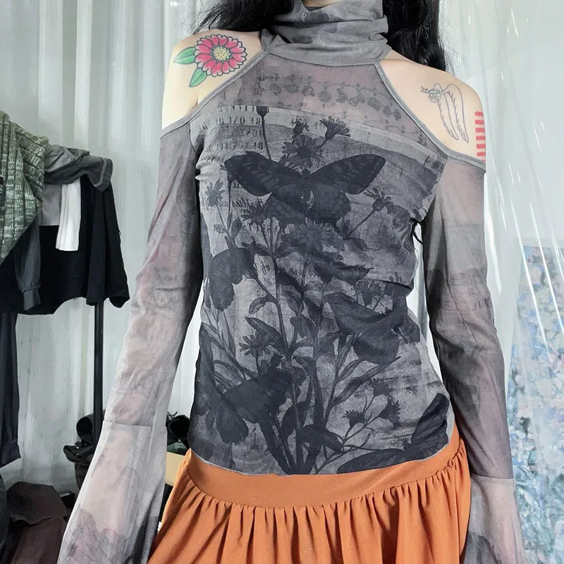 Goth Dark Fairy Grunge Aesthetic Mesh T-shirts Mall Gothic Print Women Y2k Crop Tops Turtleneck Open Shoulder Flare Sleeve Tees