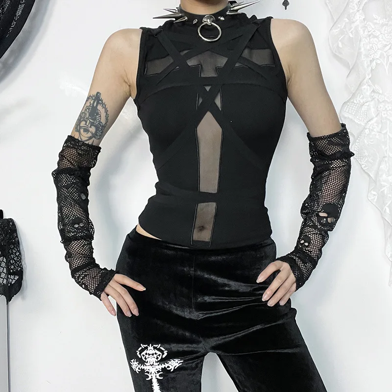 Goth Dark Mesh See Through Gothic Women Sexy Bodysuits Y2k Heart Velvet Sleeveless Halter Tops Grunge Backless Bodycon Bodysuit