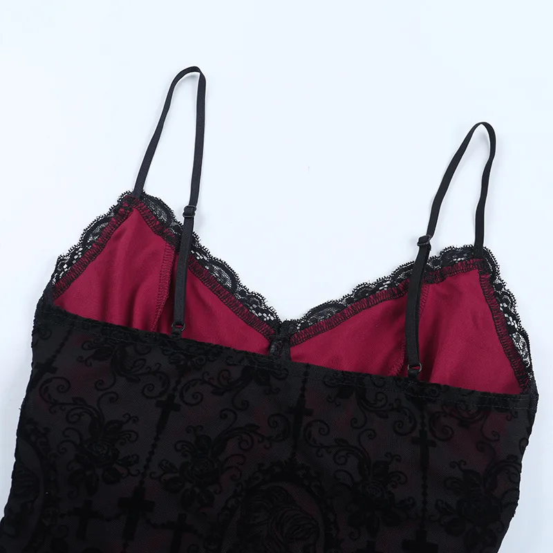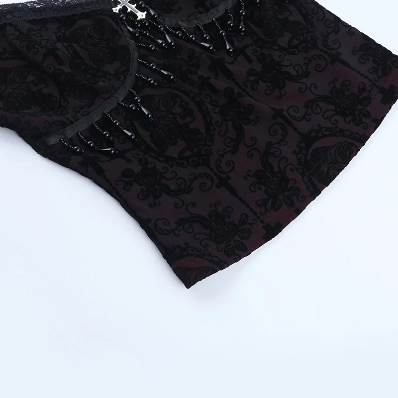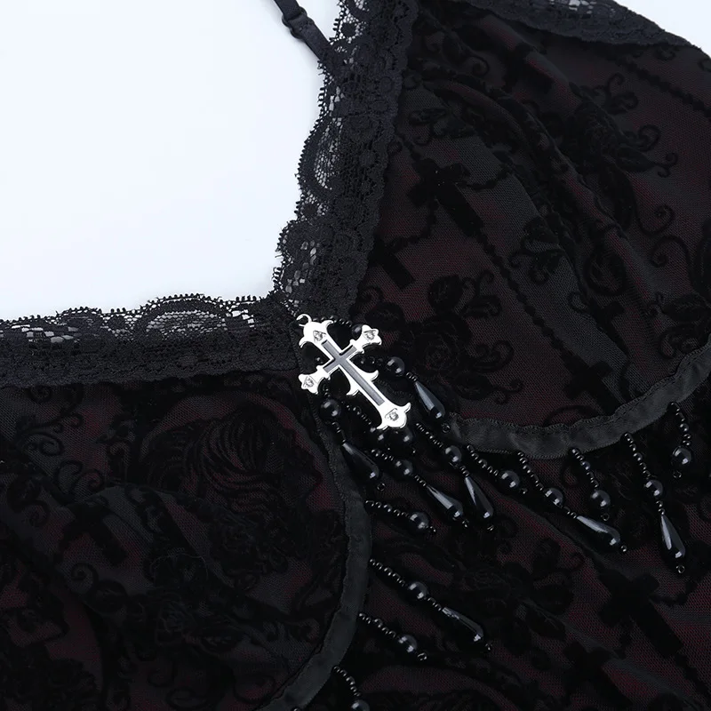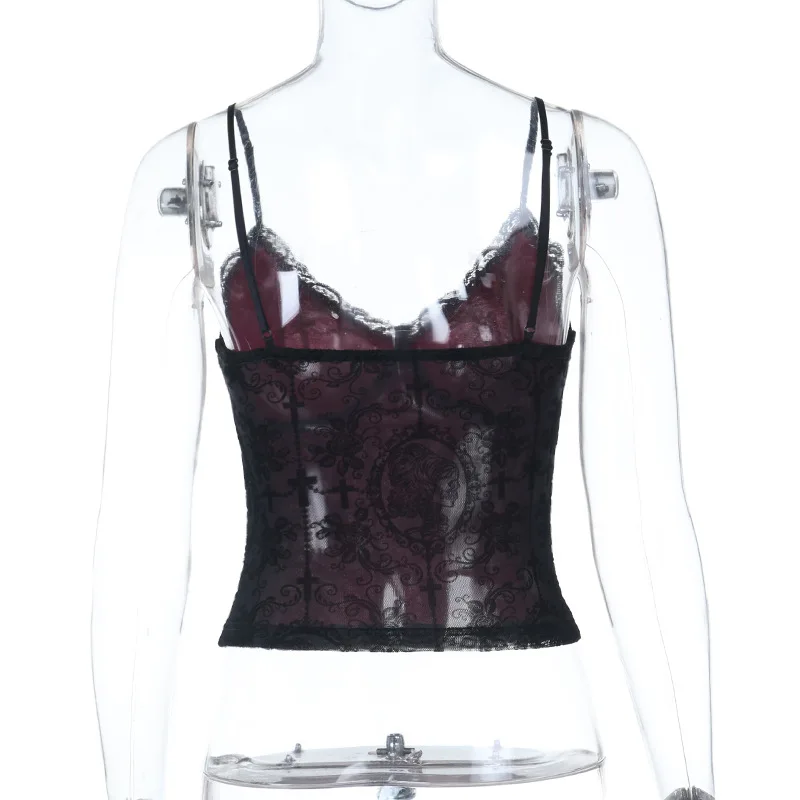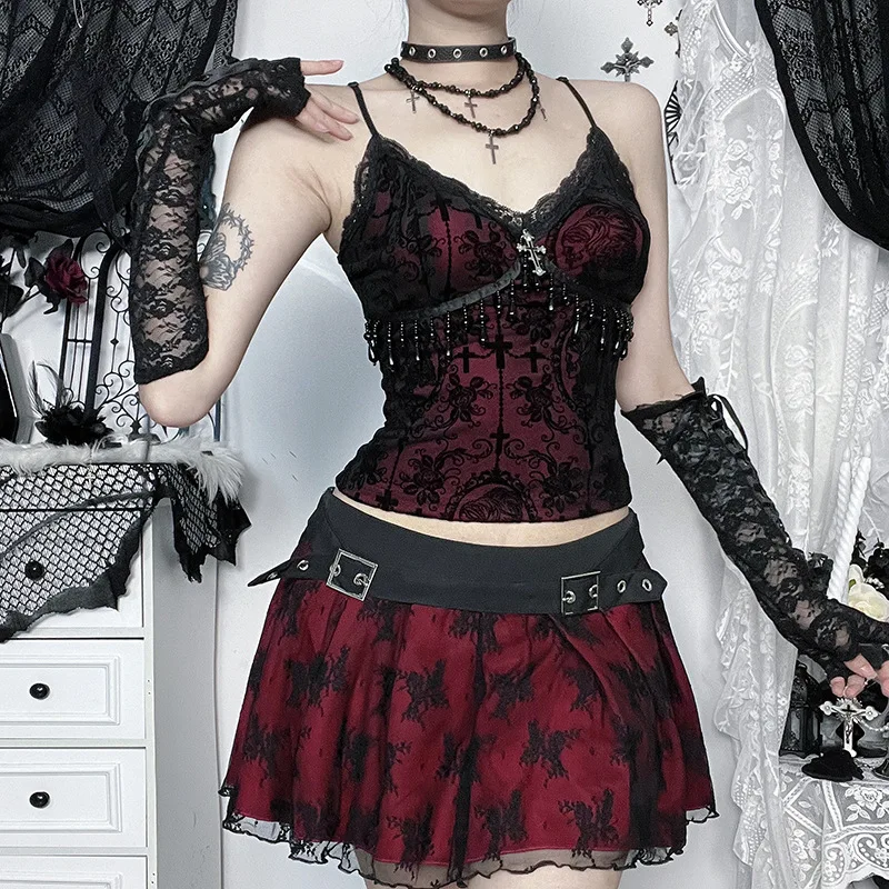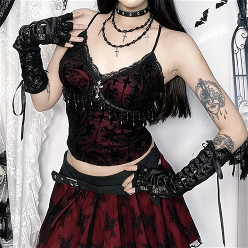 Goth Dark Alt Teachwear Fairycore Lace Flocking Straps Crop Tops Sexy Mesh Sheer Tank Top Mall Gothic Cross Tassel Slim Camisole