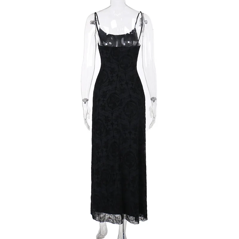 Goth Dark Cross Flocking Mall Gothic Aesthetic Dresses Grunge Punk Mesh Elegant Party Long Dress Sling Slim Sexy Emo Alt Outfits