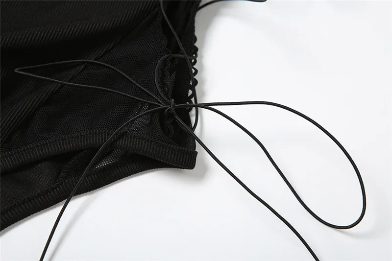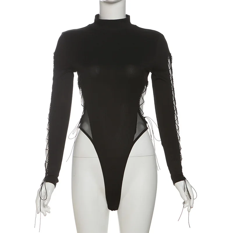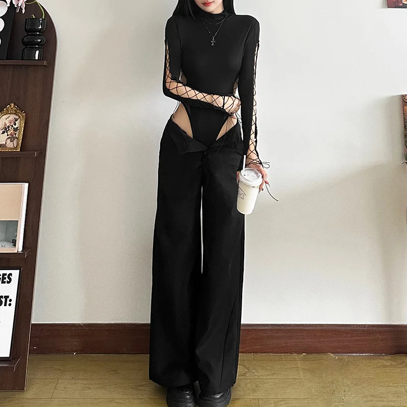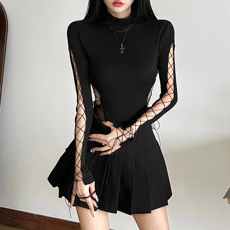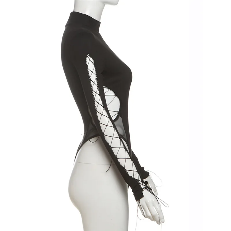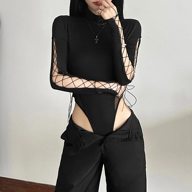 Goth Dark Half High Collar Skinny Bodysuit Hot Sexy Hollow Out Bandage One-Piece Tops Gothic Streetwear Cyber Y2K Slim Bodysuits