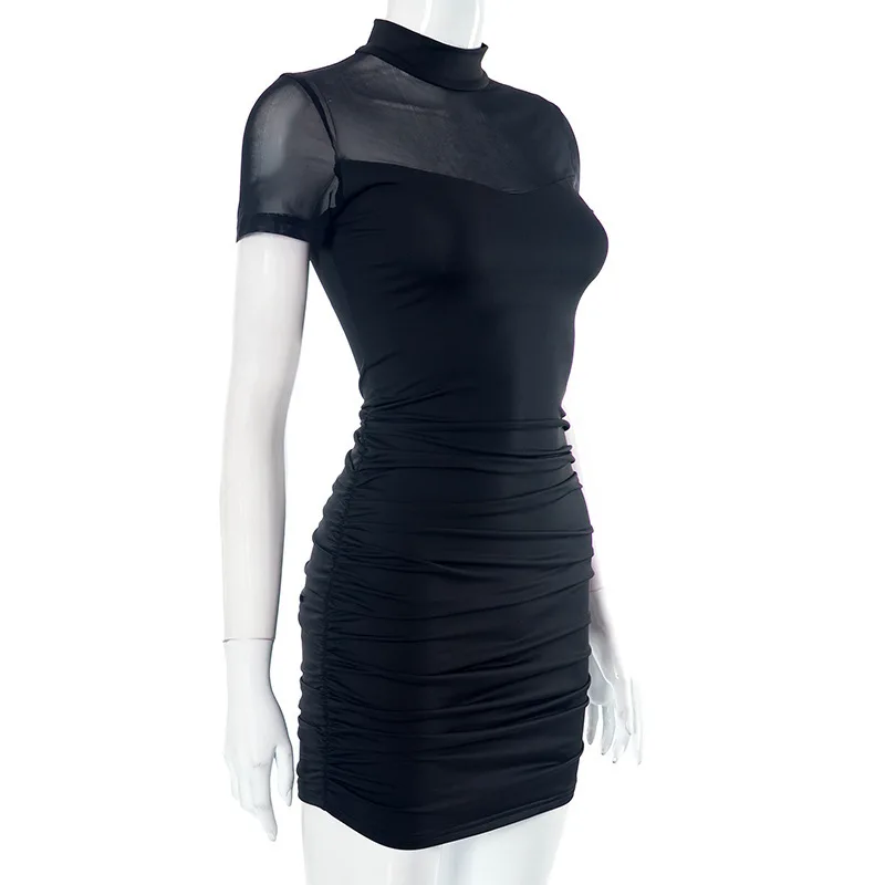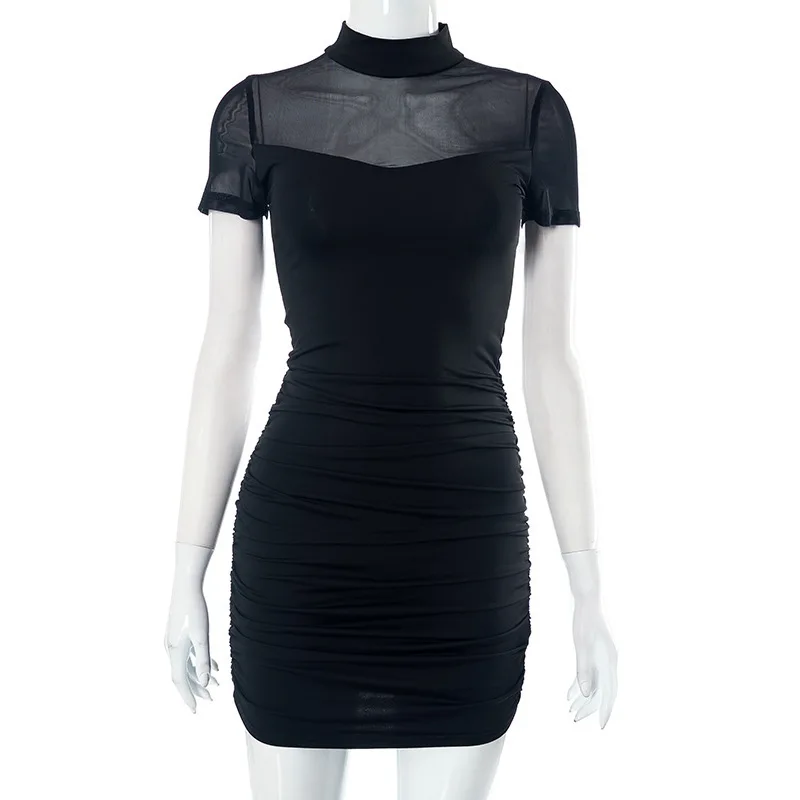 Goth Dark Mall Goth Mesh Patchwork Short Sleeve Mini Dress Cyber Y2K Half High Collar Pleat Bodycon Dresses Women Slim Techwear