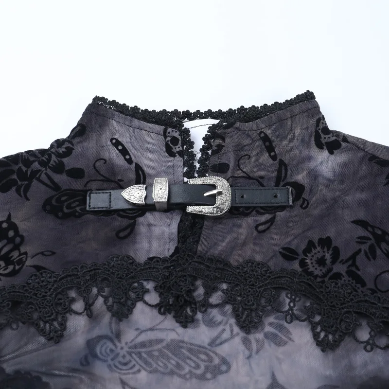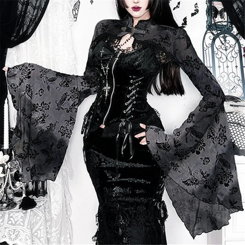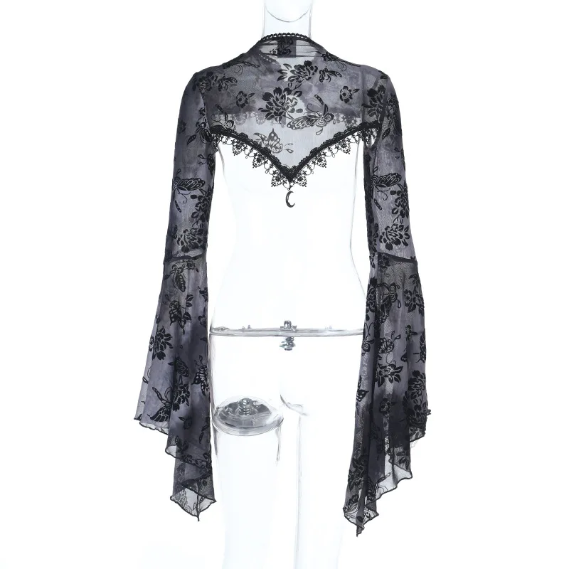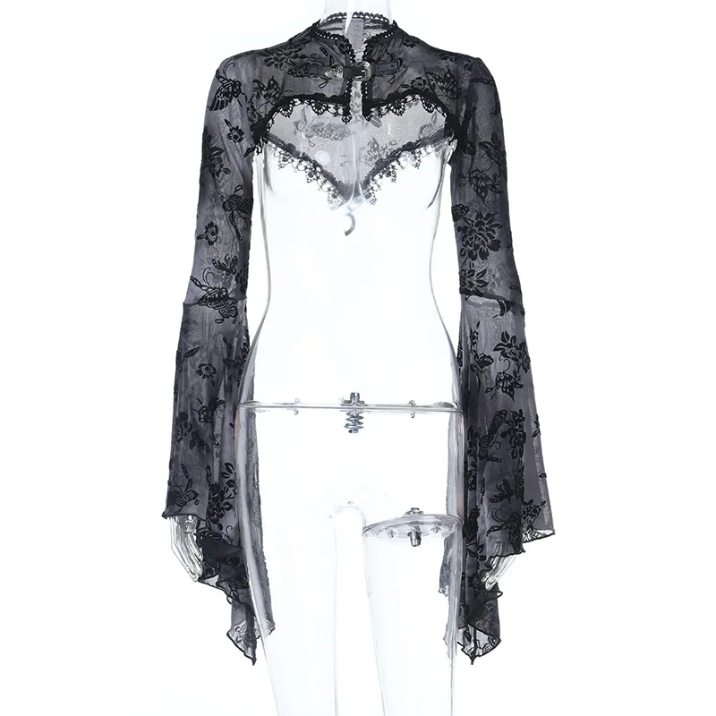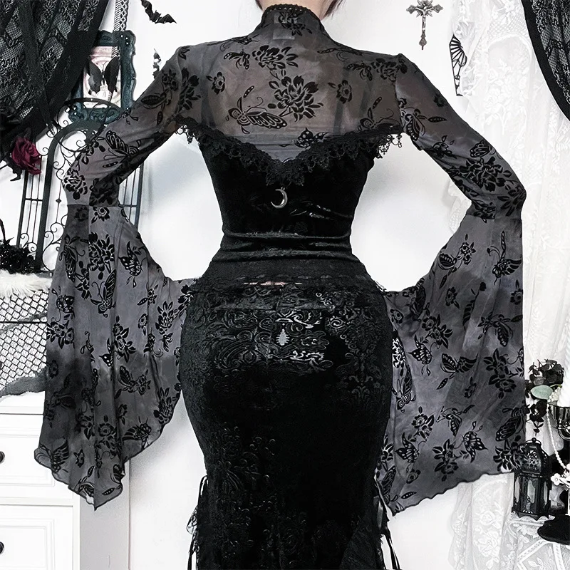 Goth Dark See Through Mesh Flocking Print Crop Shrug Tops Mall Gothic Flare Sleeve Smock Shawl Women Thin Coats Alt Streetwear