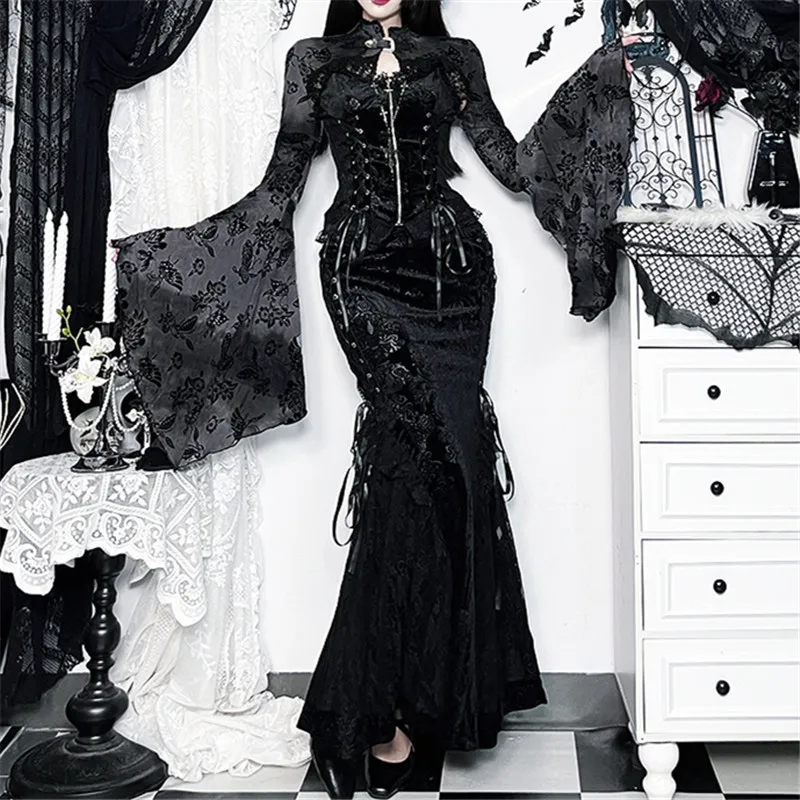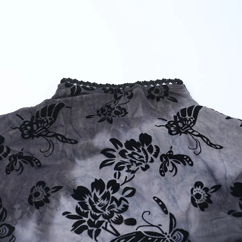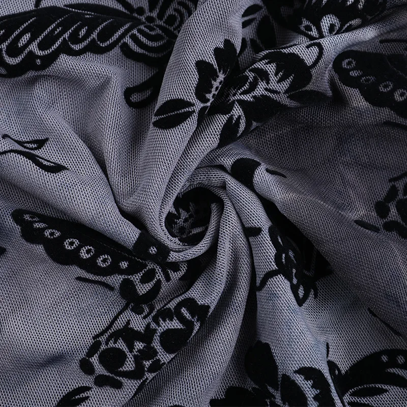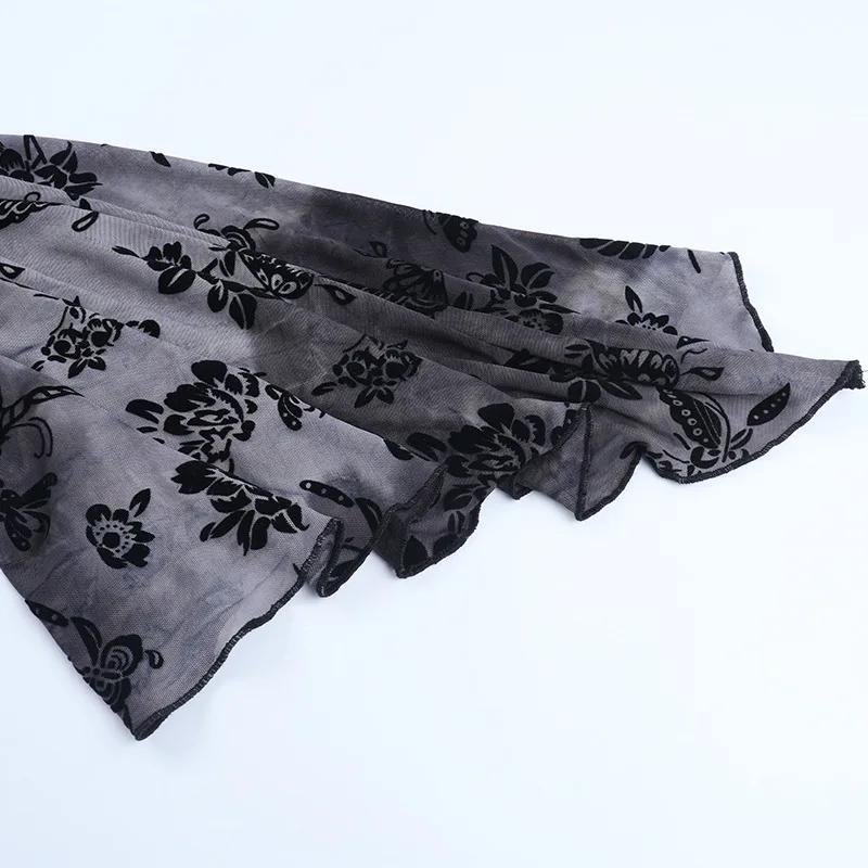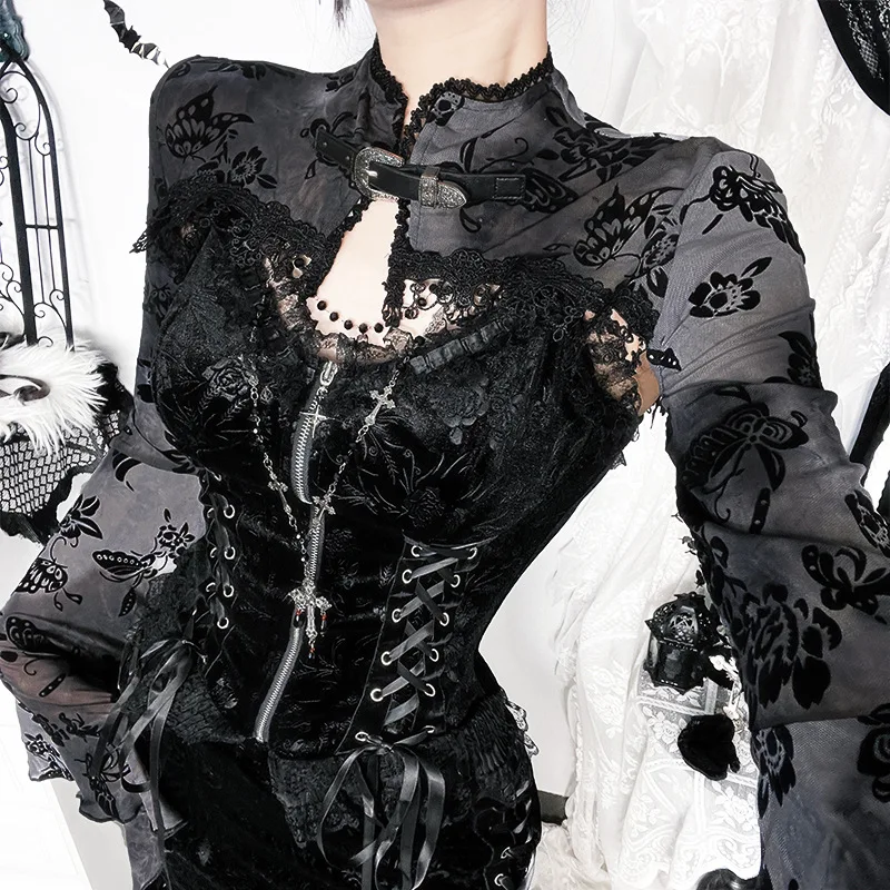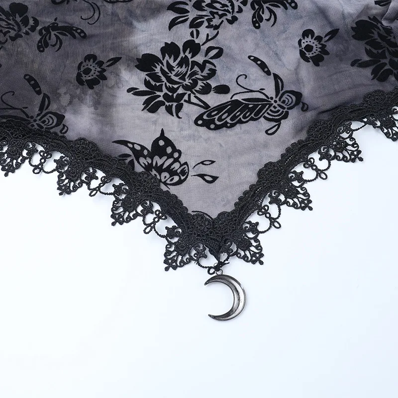 Goth Dark See Through Mesh Flocking Print Crop Shrug Tops Mall Gothic Flare Sleeve Smock Shawl Women Thin Coats Alt Streetwear