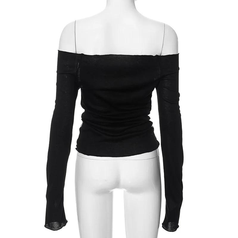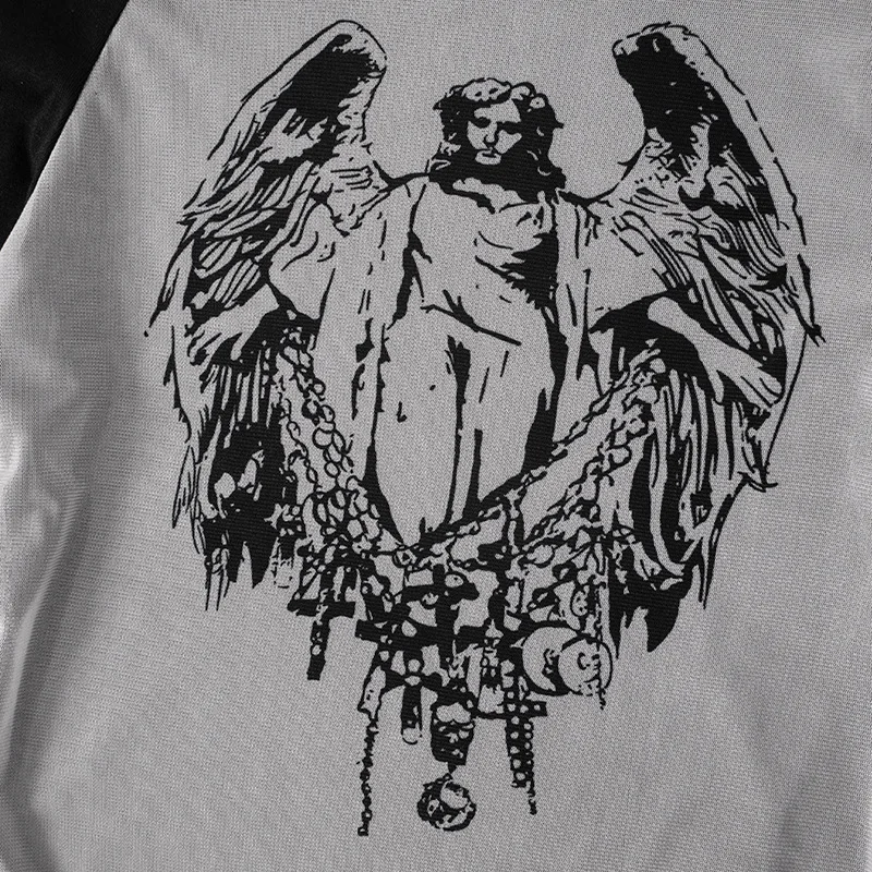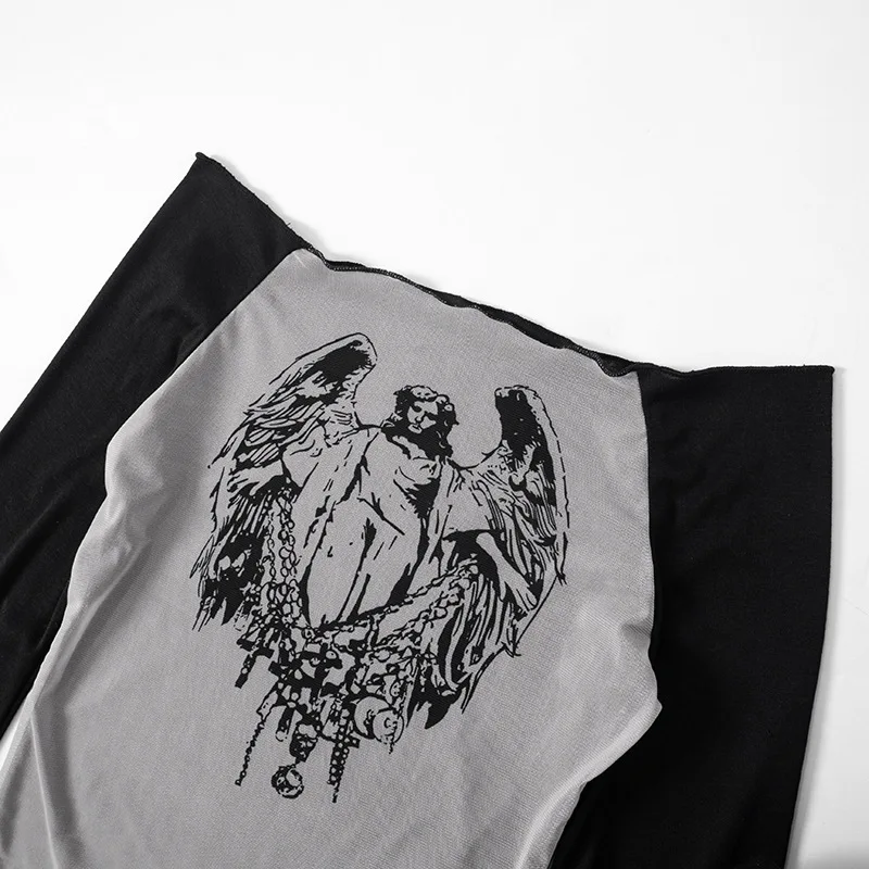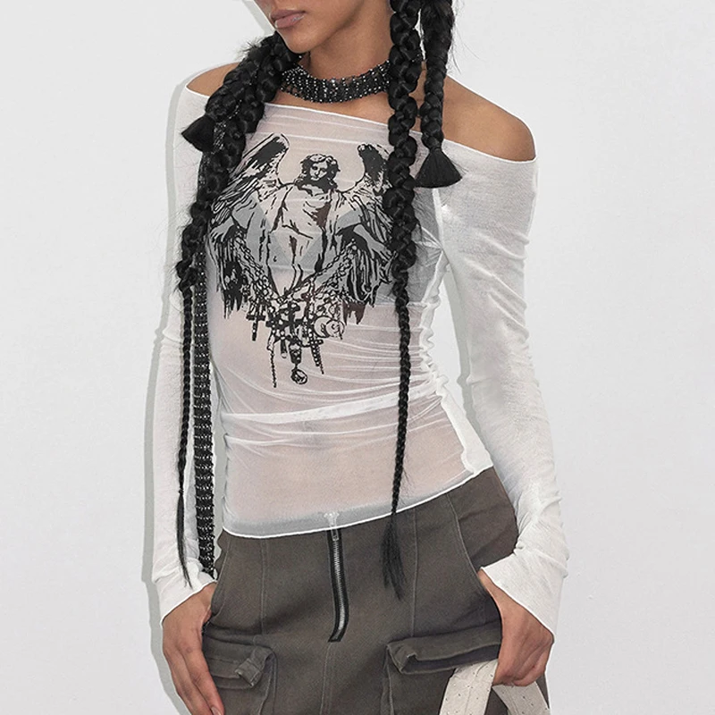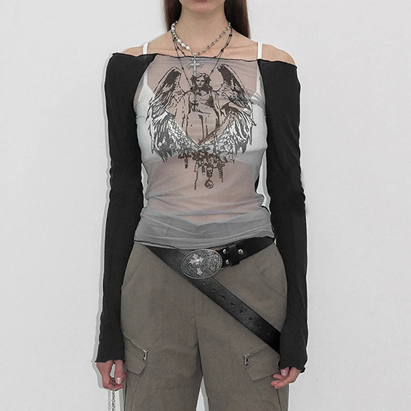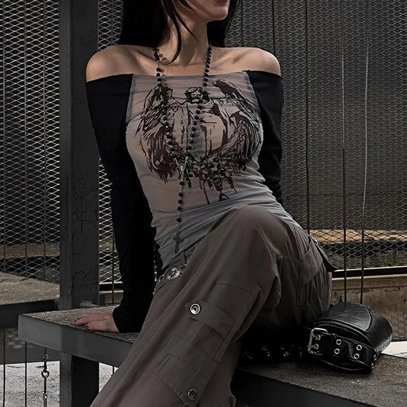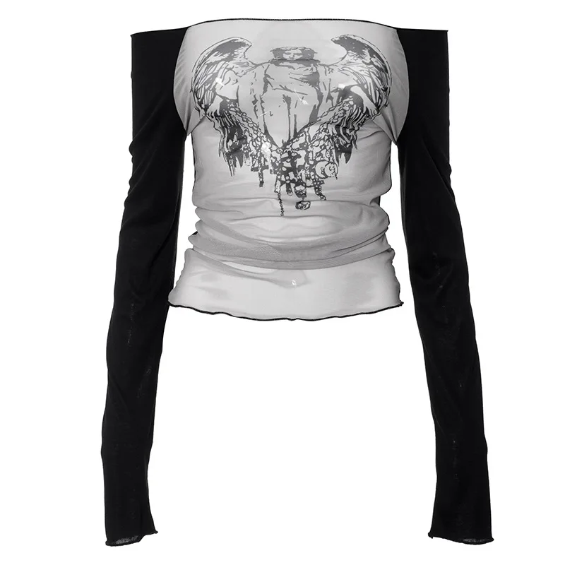 Goth Dark Techwear Fashion Cyber Gothic Crop Tops Y2k Punk Mesh Transprent Sexy Print Tshirts Women Off Shoulder Color Match Tee