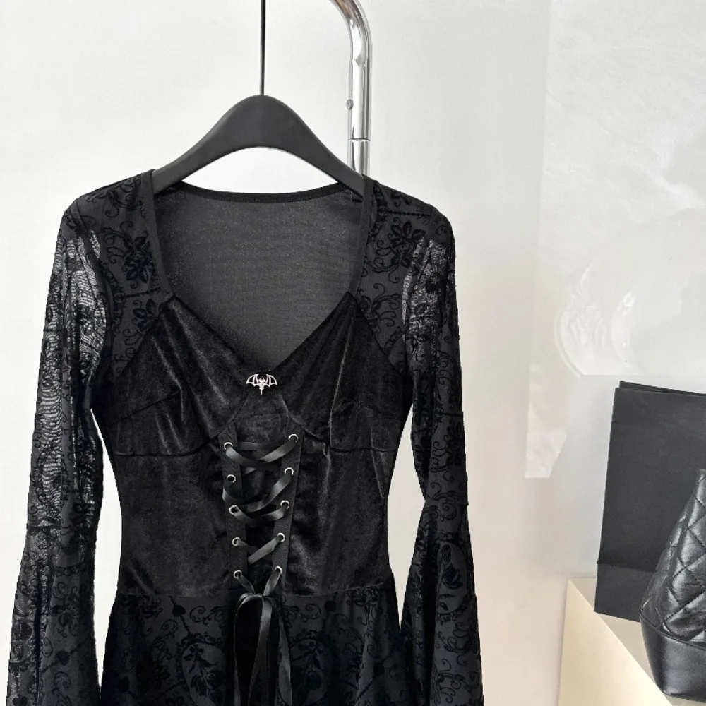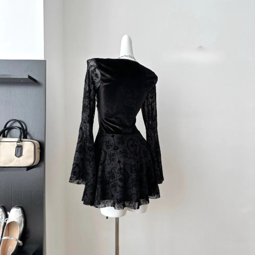 Gothic Dark Punk Retro Velvet Black Women’s Dress Original Design 2025 Autumn New Sweet Cool Y2k Sexy Halloween Costume Ladies
