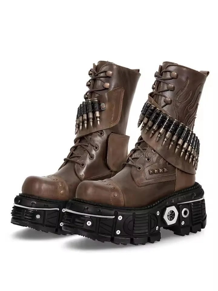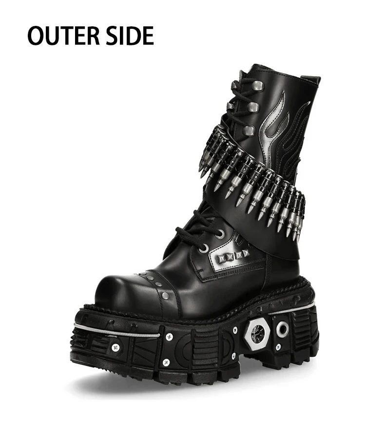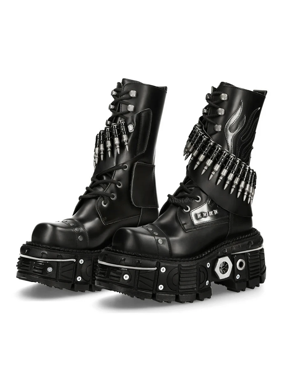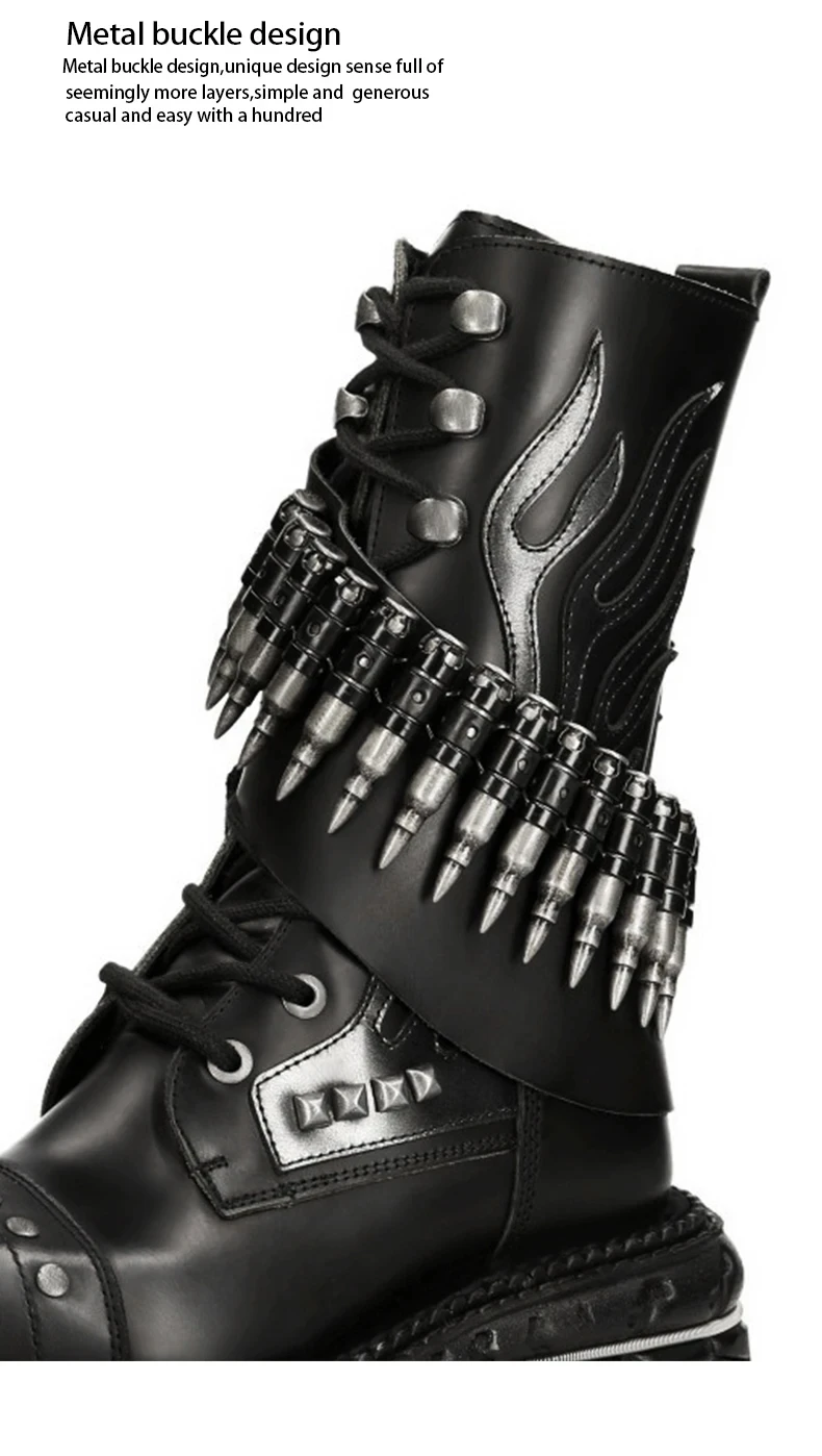 Turn heads with these gothic punk platform boots that blend industrial aesthetics with steampunk flair. Crafted from premium genuine leather, they feature a rugged flame pattern, bullet chain embellishments, and heavy-duty metal accents — every detail radiates attitude and rebellion.