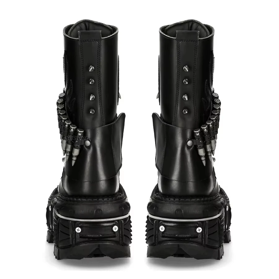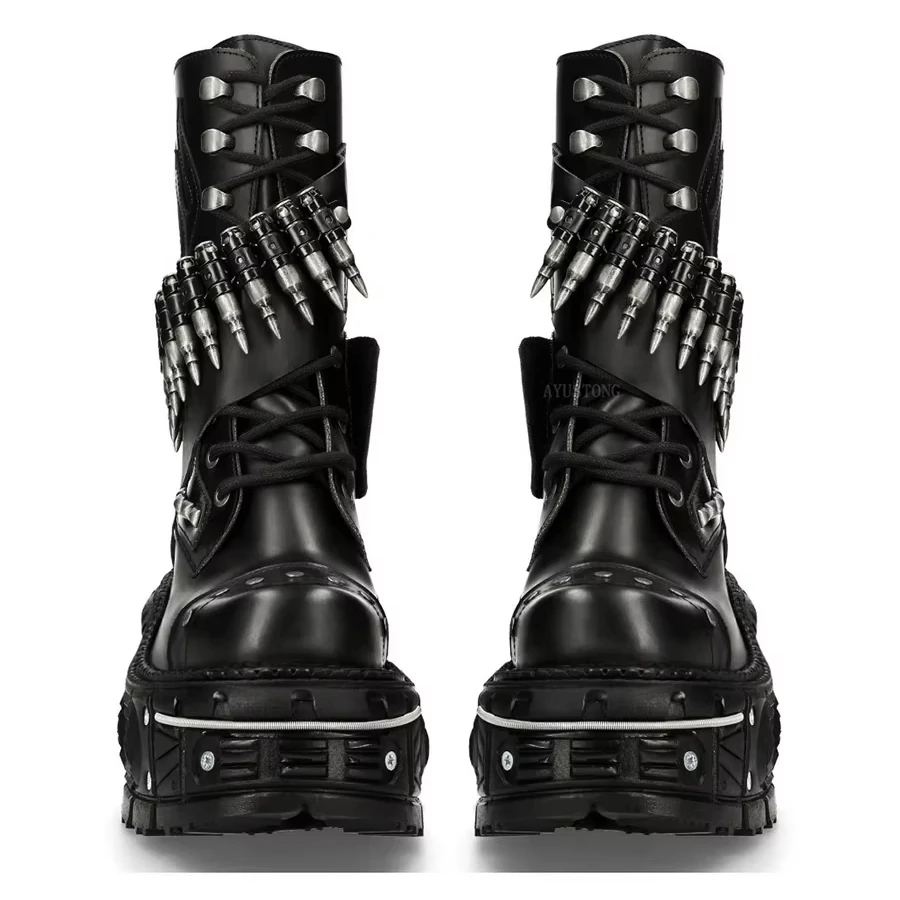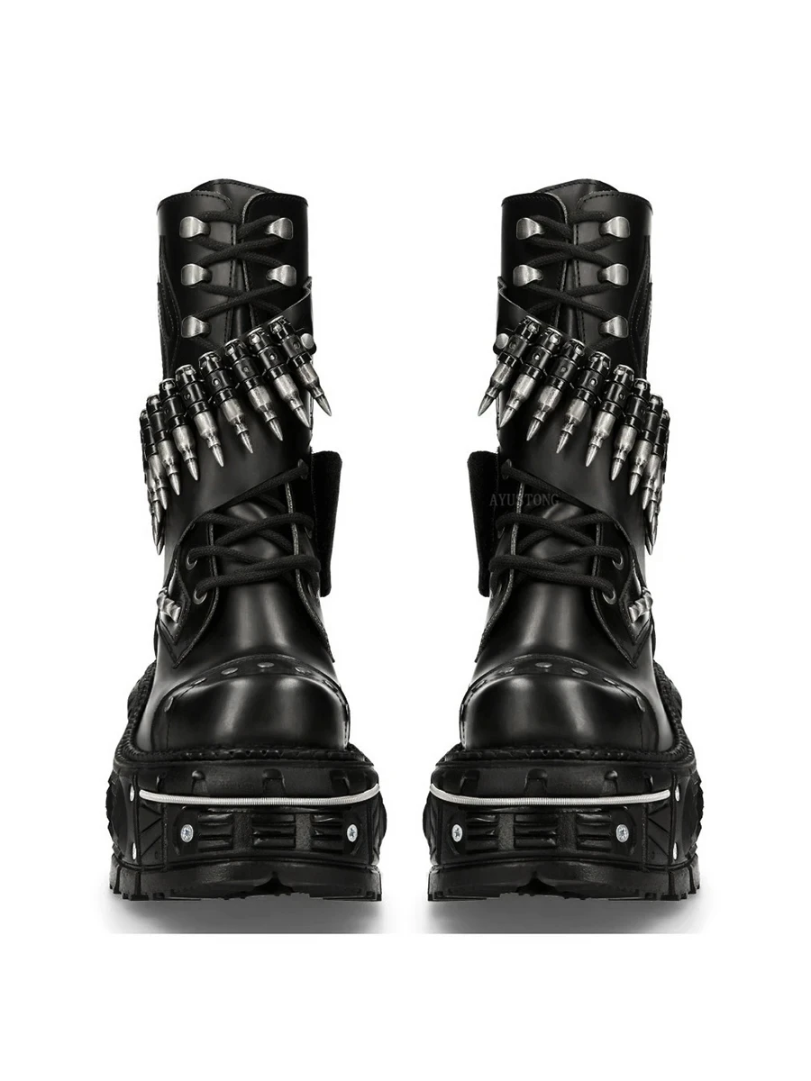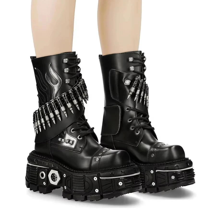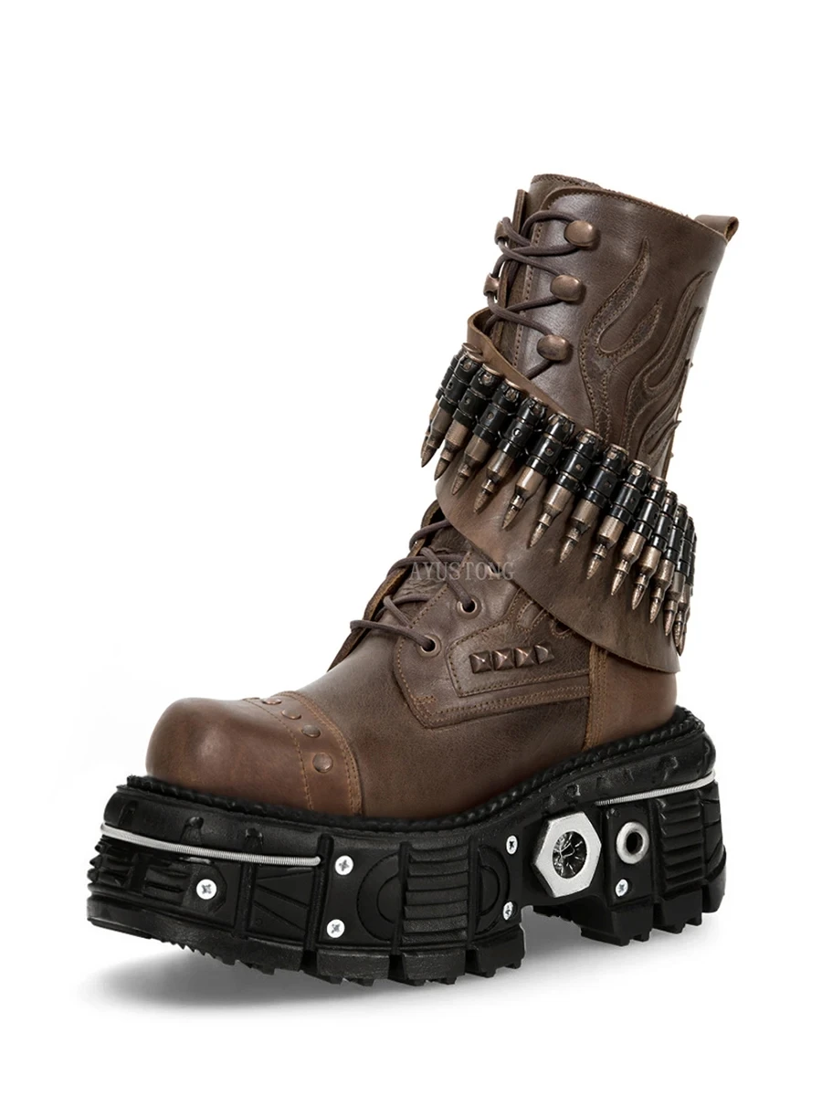Turn heads with these gothic punk platform boots that blend industrial aesthetics with steampunk flair. Crafted from premium genuine leather, they feature a rugged flame pattern, bullet chain embellishments, and heavy-duty metal accents — every detail radiates attitude and rebellion.
