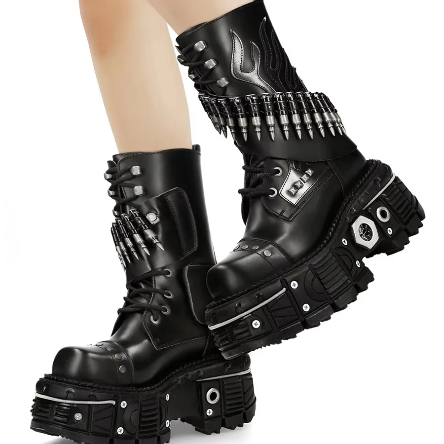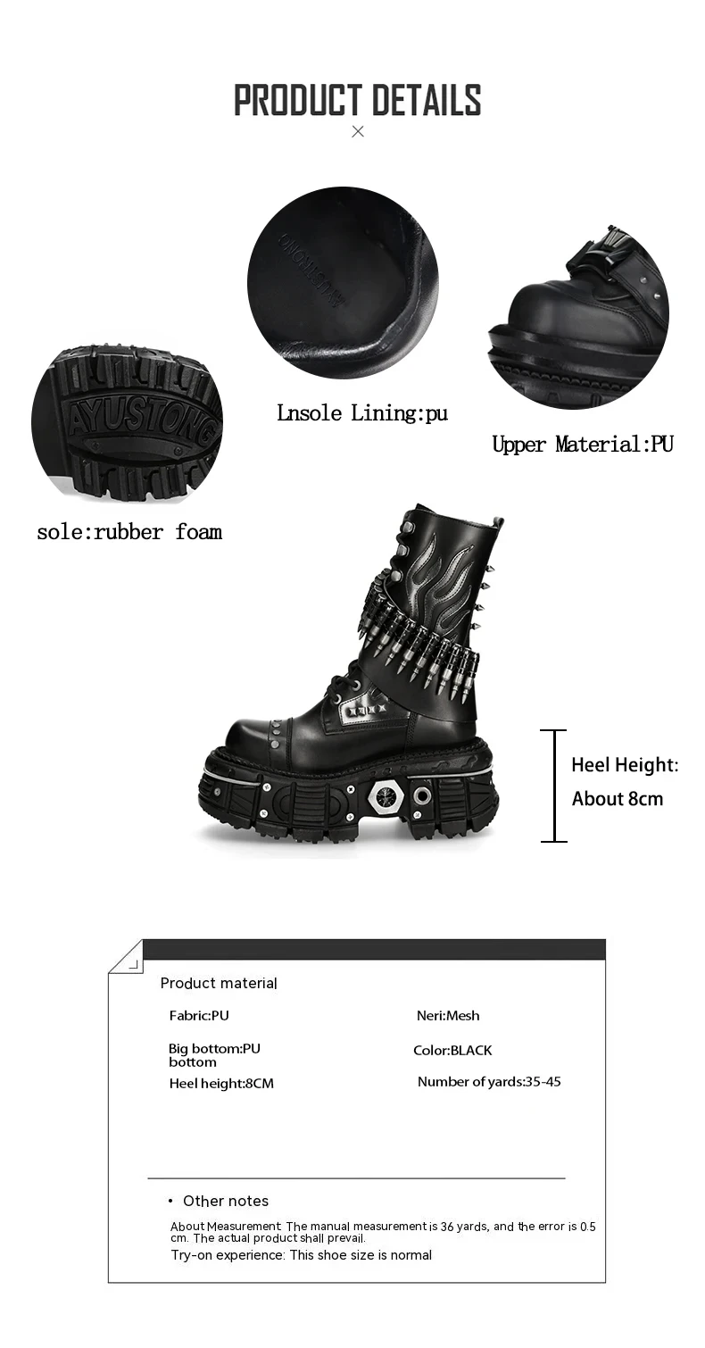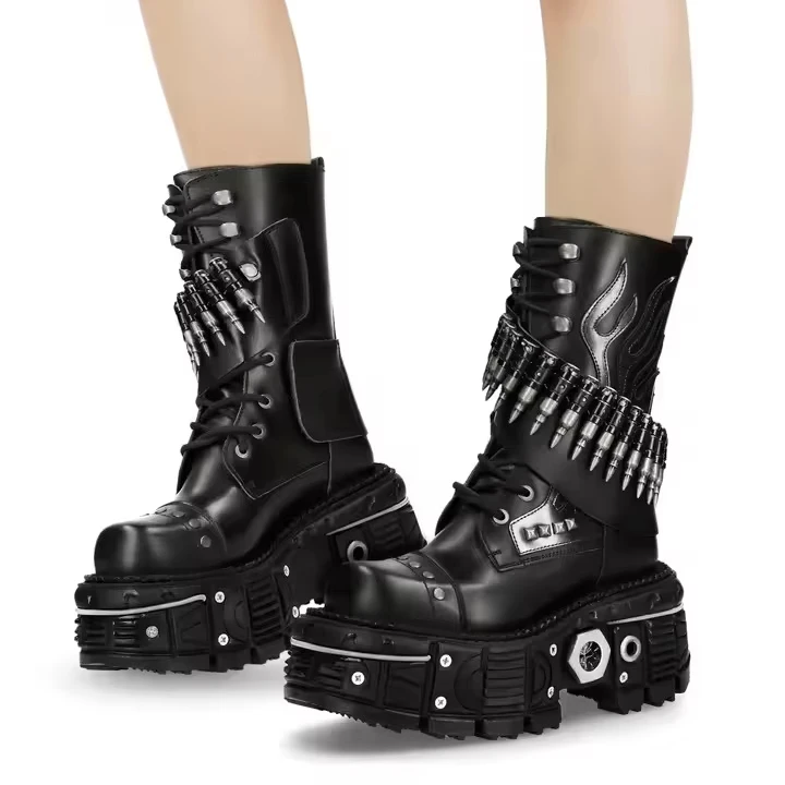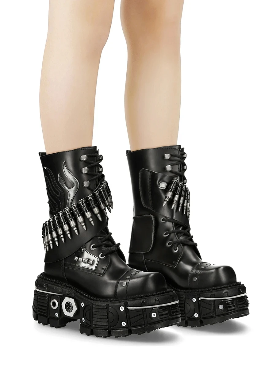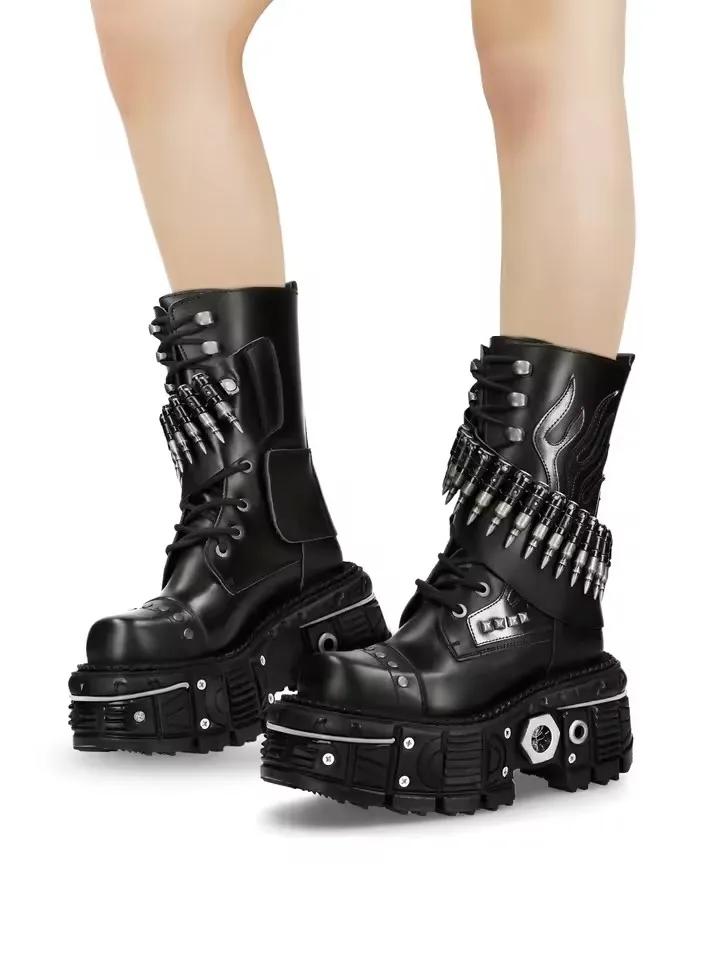 1.Edgy Gothic Design: Inspired by cyberpunk and industrial aesthetics, these statement boots feature bold flame stitching and bullet chain detailing for a striking look.