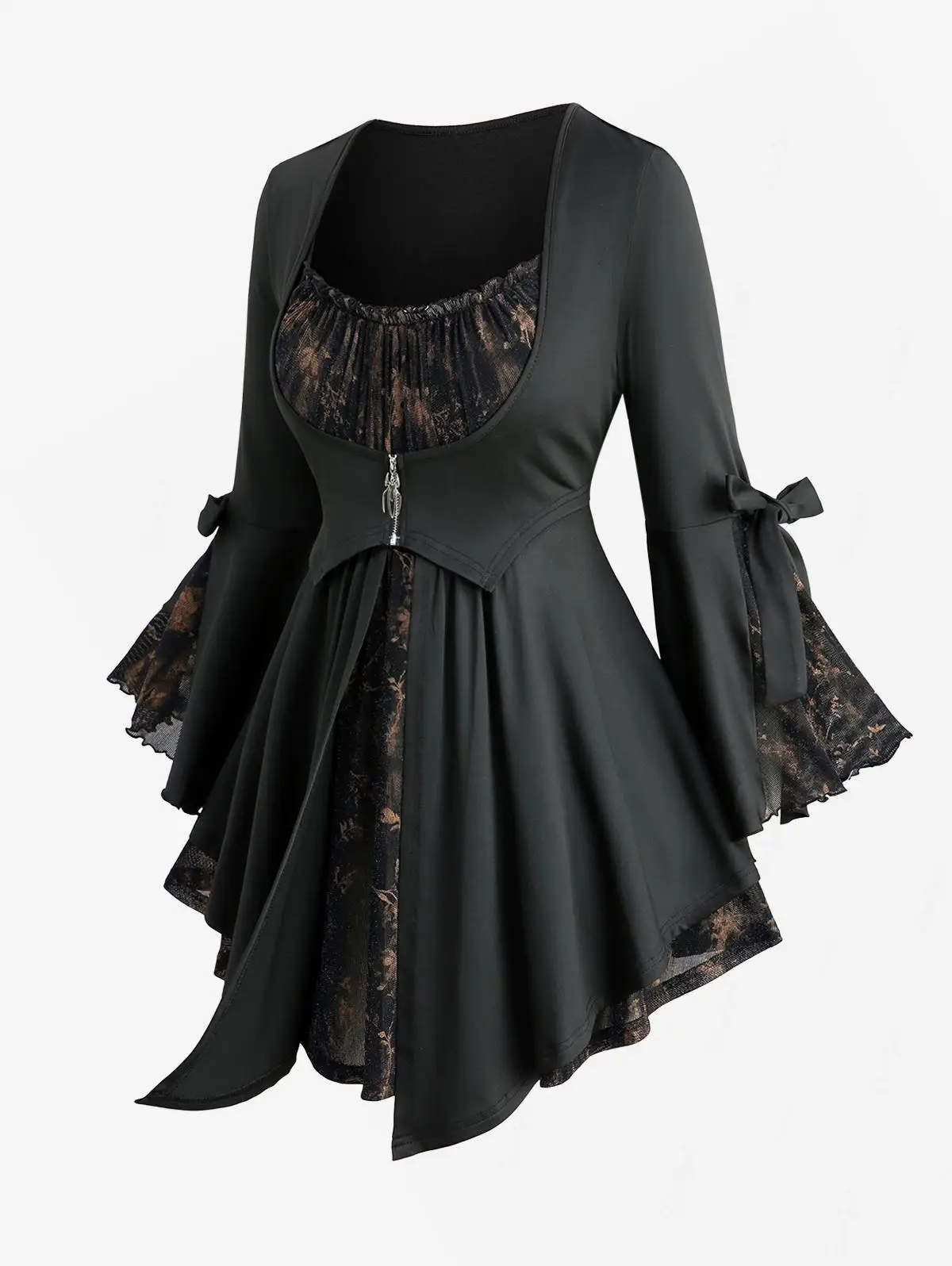 ROSEGAL Plus Size Women’s Blouses Flowers Leaf Printed Ruffles Ruched Spider Shaped Zipper Bowknot Flare Sleeve 2 In 1 Tops