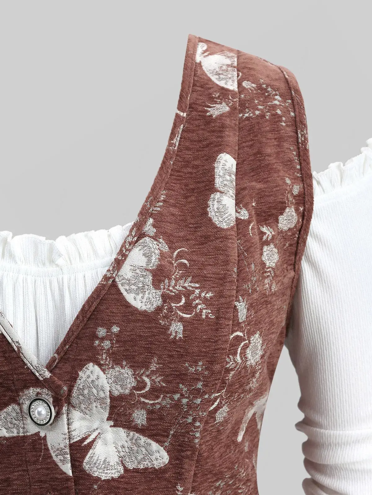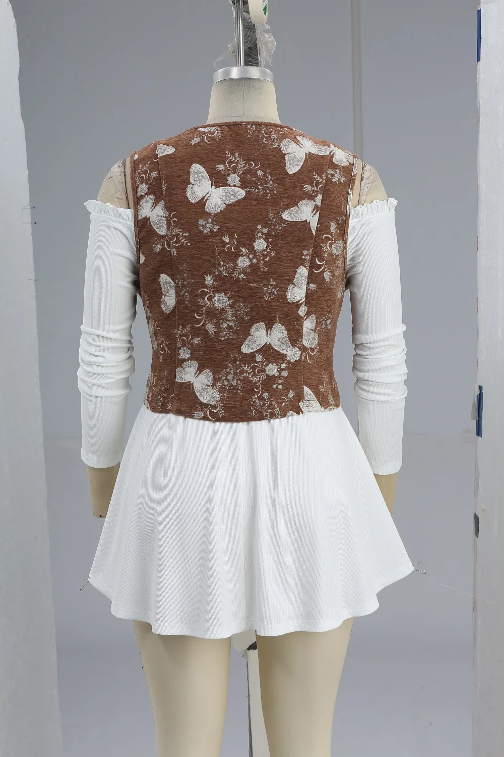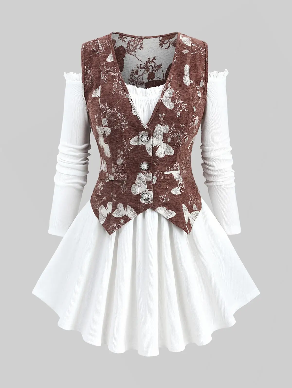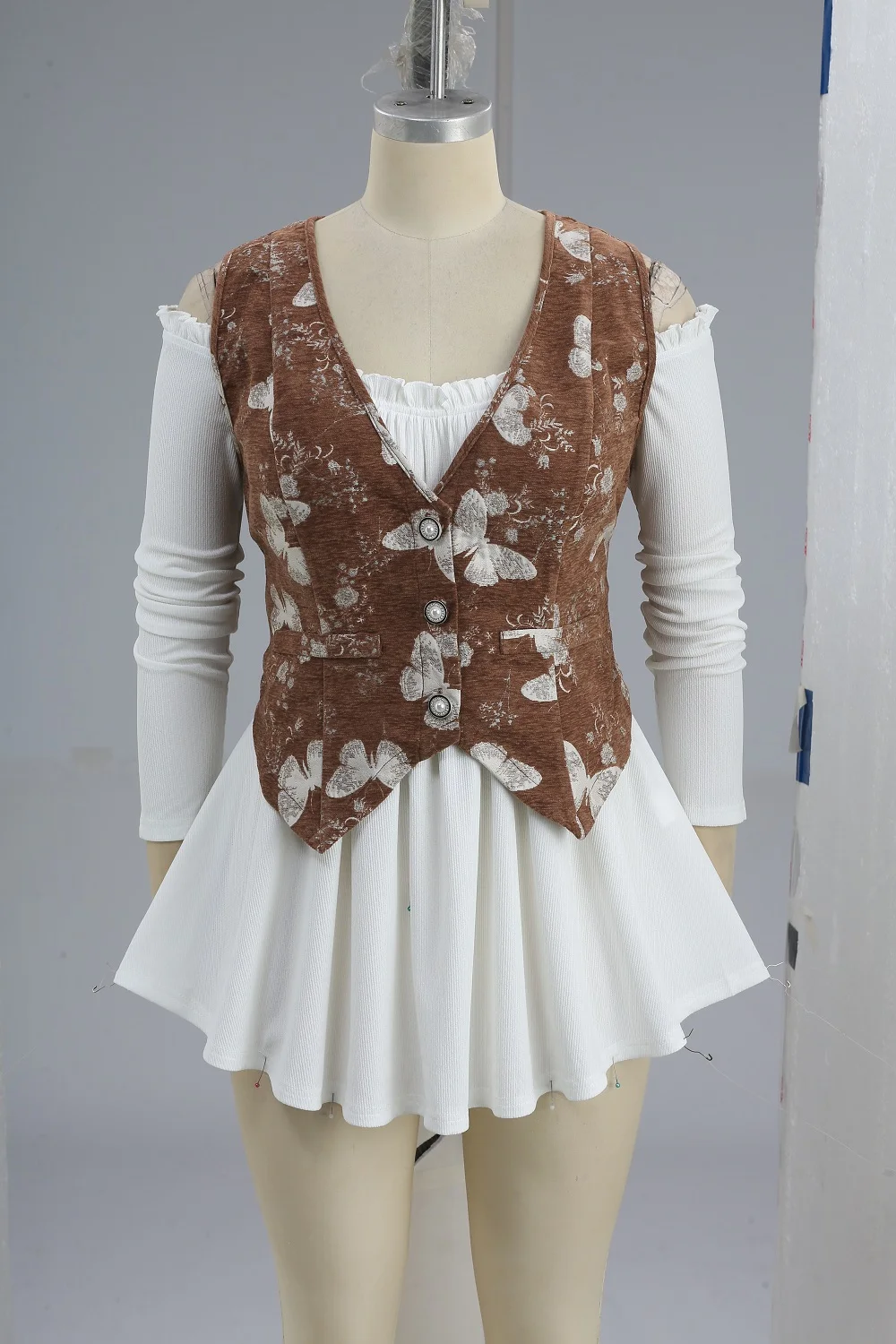 ROSEGAL Plus Size Women’s T-shirts Set Coffee Butterfly Flowers Printed Buttons Vest And White Ruffles Ruched Cold Shoulder Tops