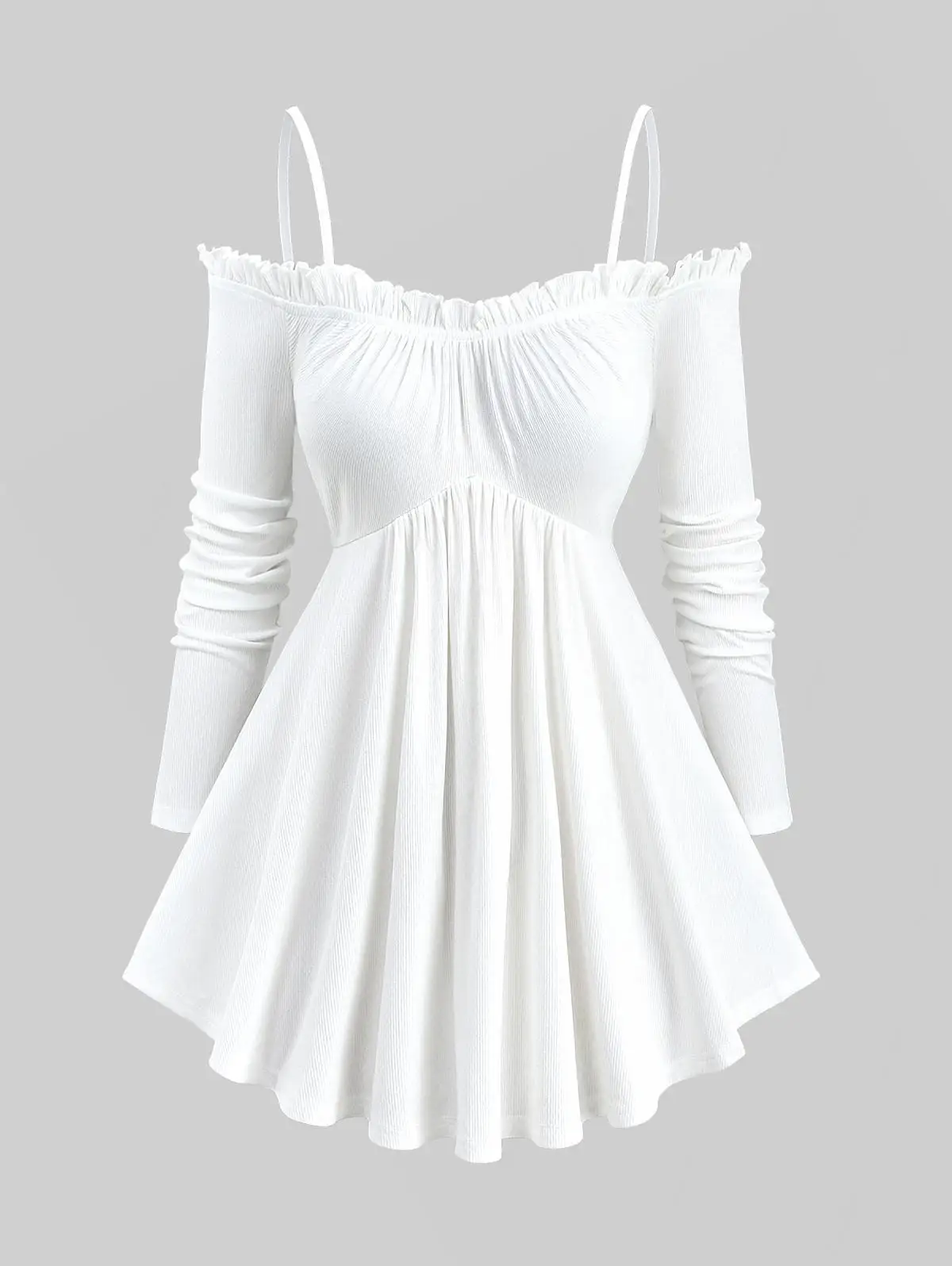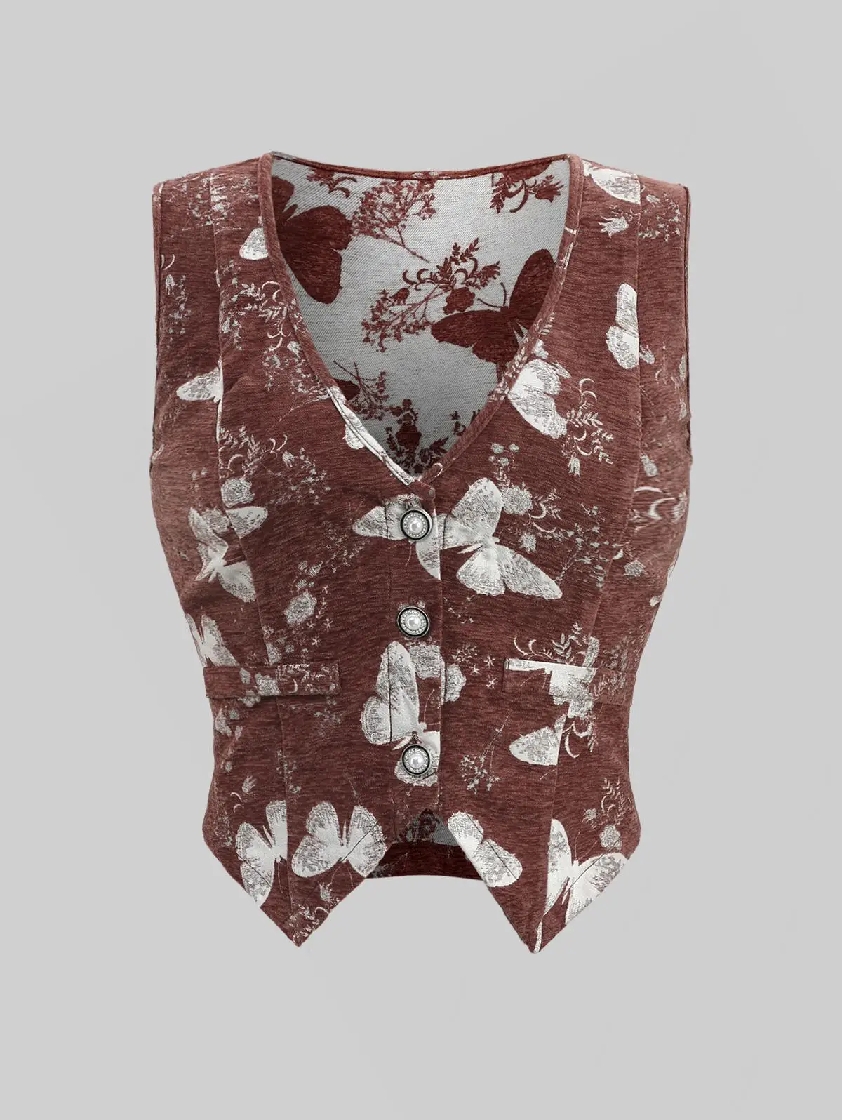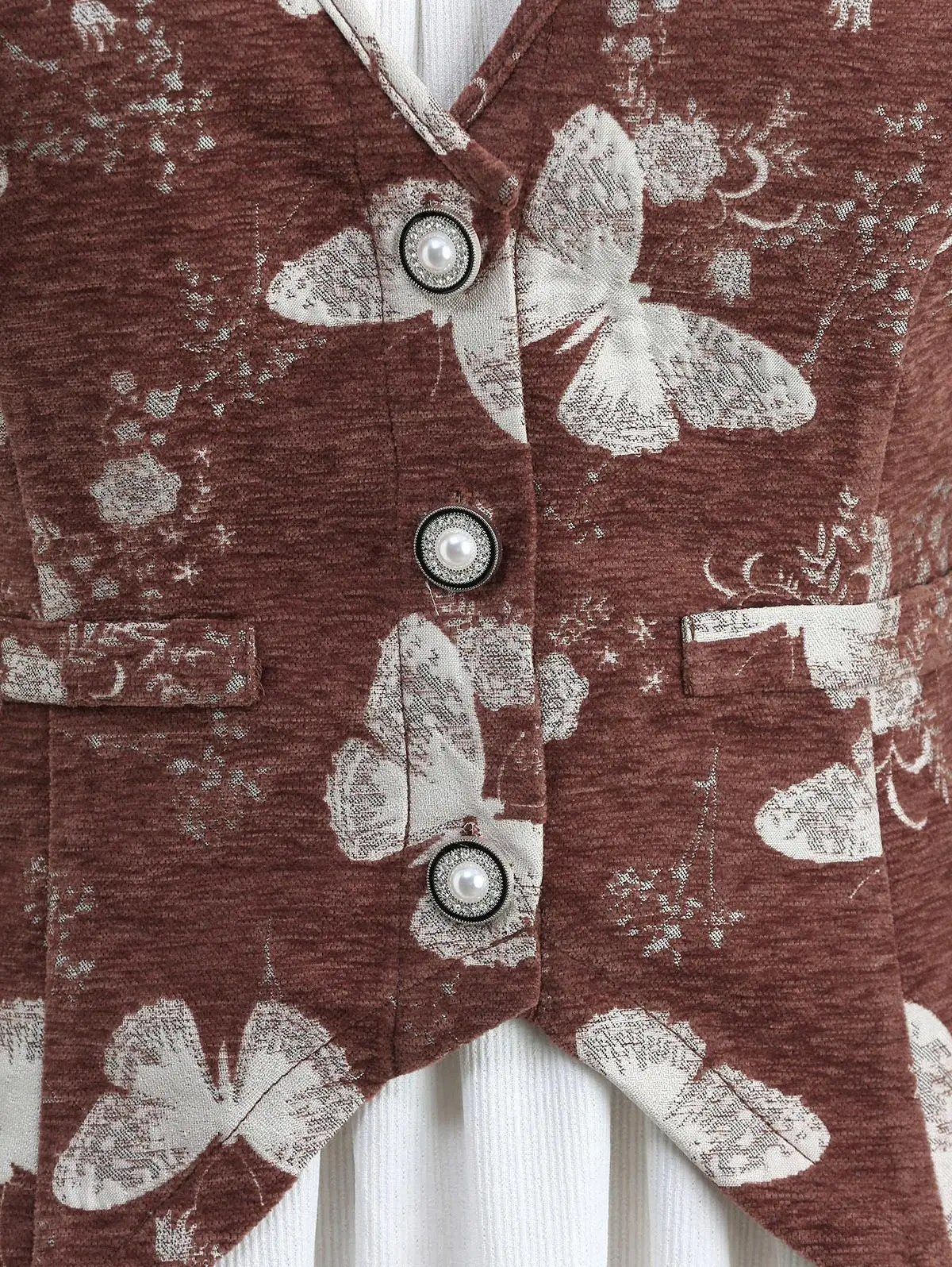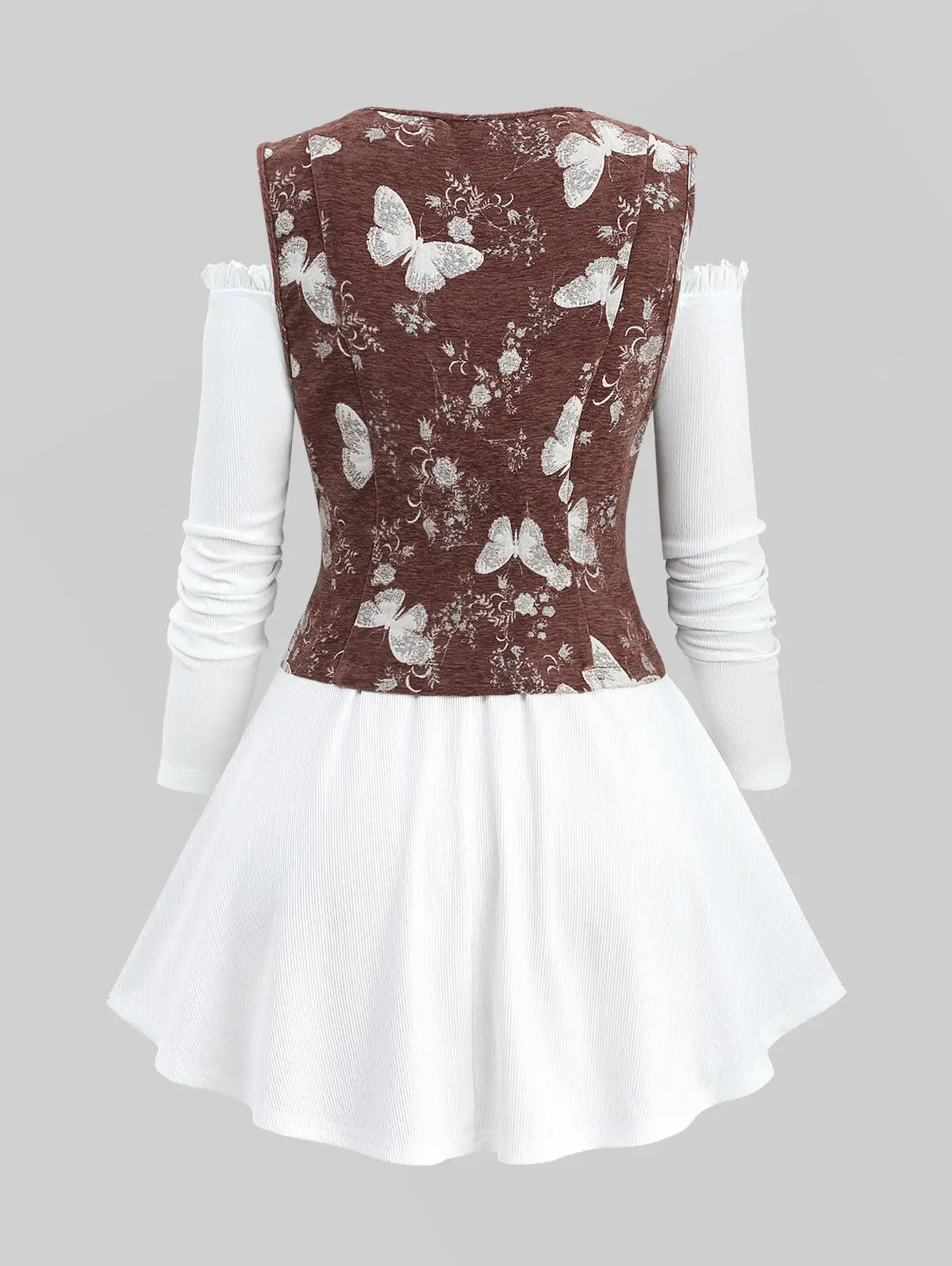 ROSEGAL Plus Size Women’s T-shirts Set Coffee Butterfly Flowers Printed Buttons Vest And White Ruffles Ruched Cold Shoulder Tops