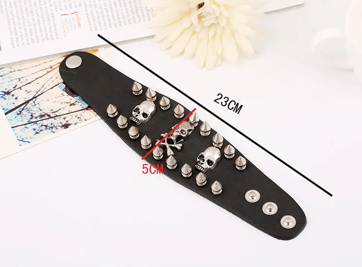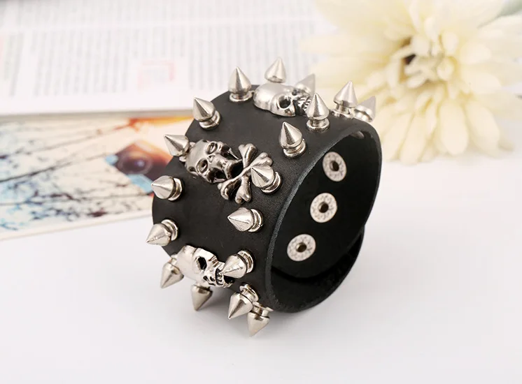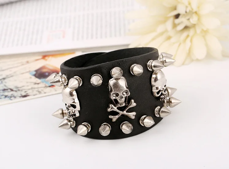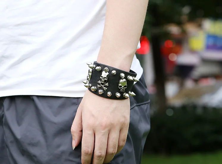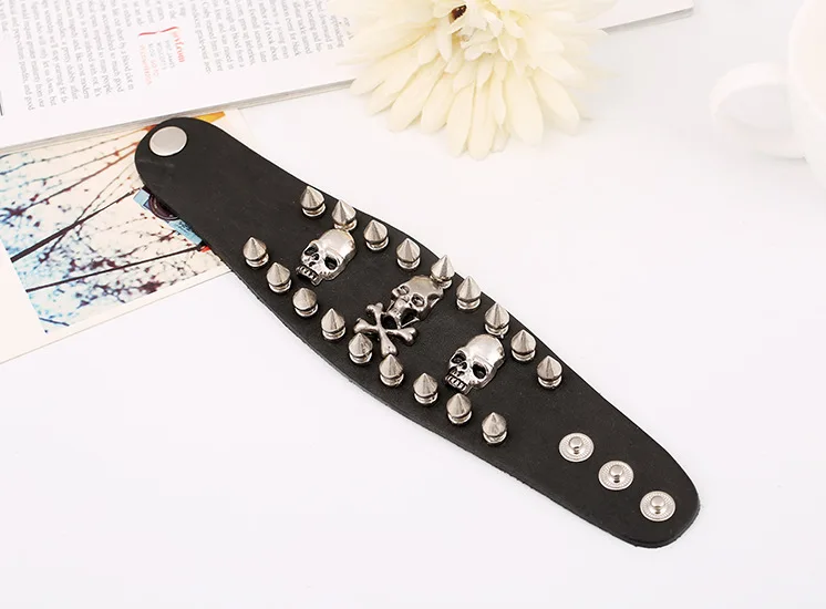 Wholesale Punk Skeleton Bracelet for Men Metal Rivet Studs Personality Genuine Leather Bracelets Bangles