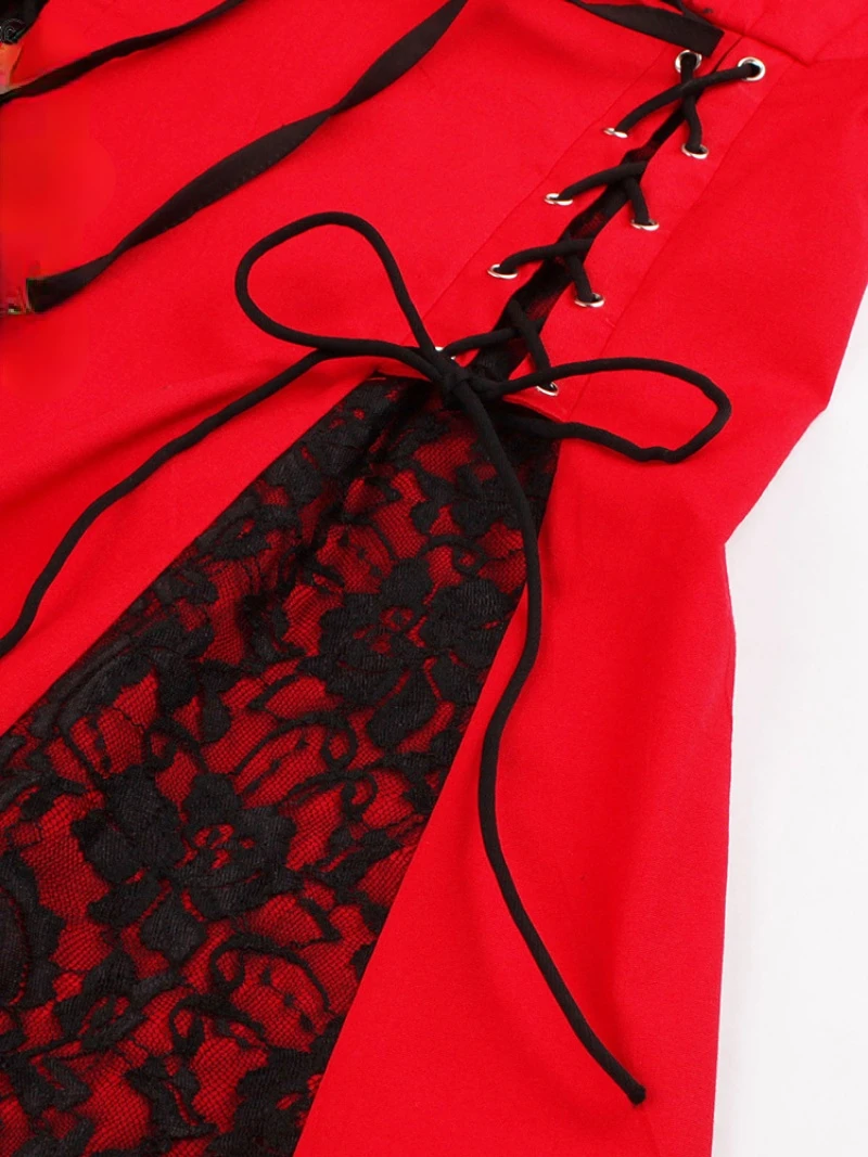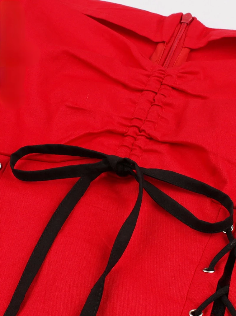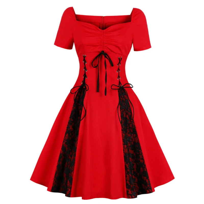 2023 Red Black Patchwork Gothic Punk Steampunk Dress Lace up Retro Vintage Swing Cotton Streetwear 50s 60s Rockabilly Jurken