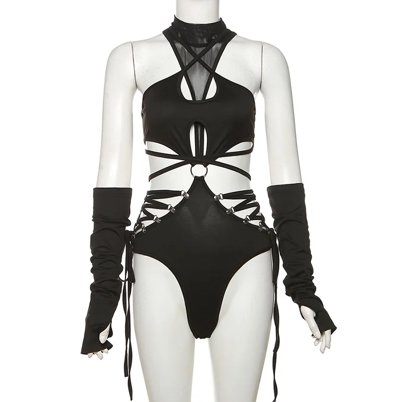 Goth Dark Bandage Hollow Out Sexy Cyber Y2k Bodysuits Gothic Techwear Mesh Patchwork Tops Female Glove Sleeve Mock Neck Bodysuit