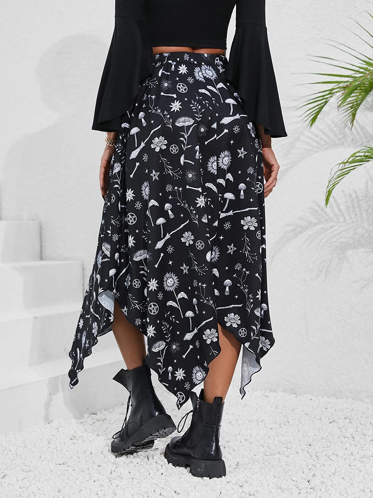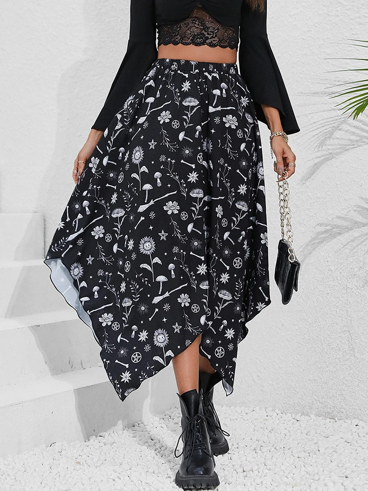 Goth Dark Casual Handkerchief Hem Printed Skirts Fairy Grunge Aesthetic Black Emo Long Skirt Female High Waist A-line Streetwear