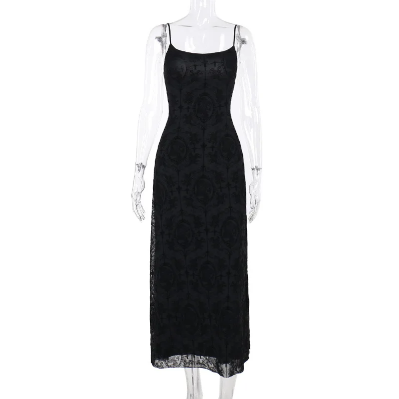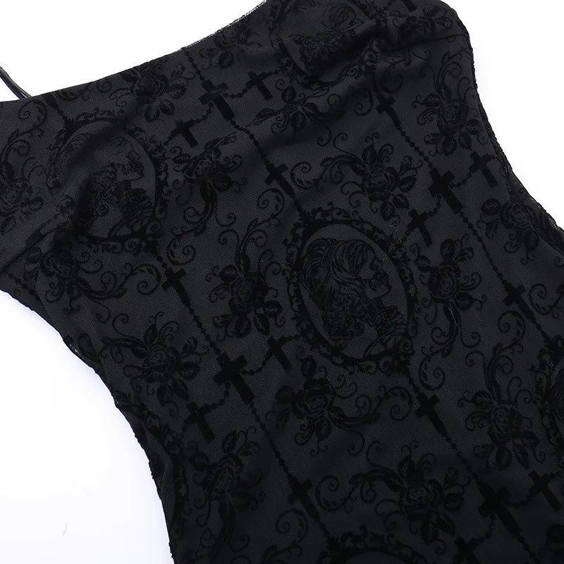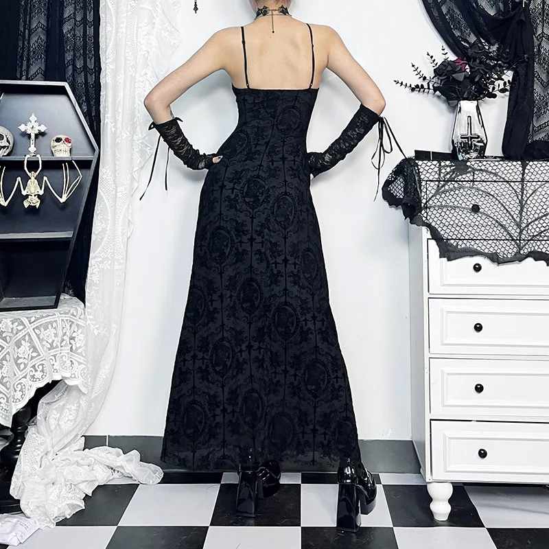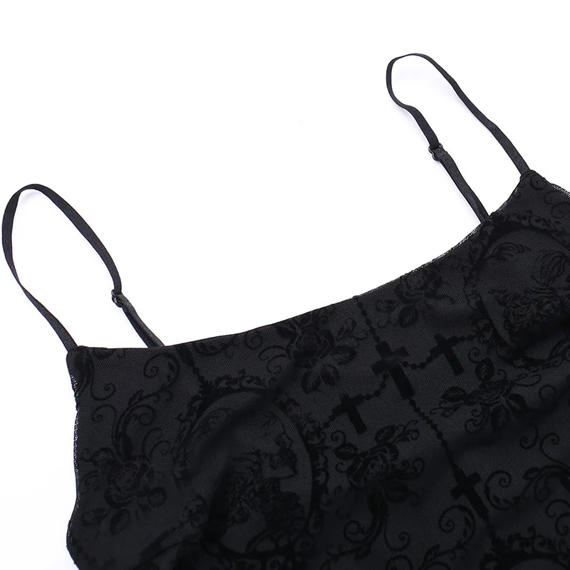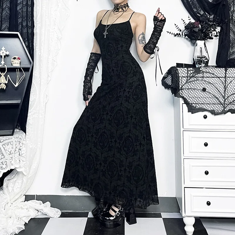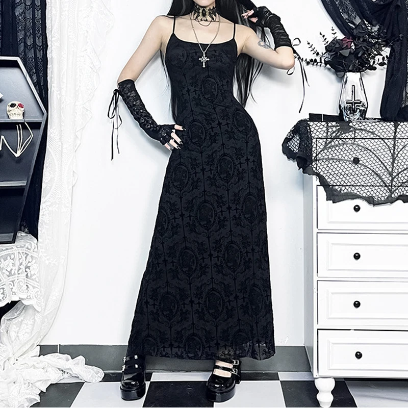 Goth Dark Cross Flocking Mall Gothic Aesthetic Dresses Grunge Punk Mesh Elegant Party Long Dress Sling Slim Sexy Emo Alt Outfits
