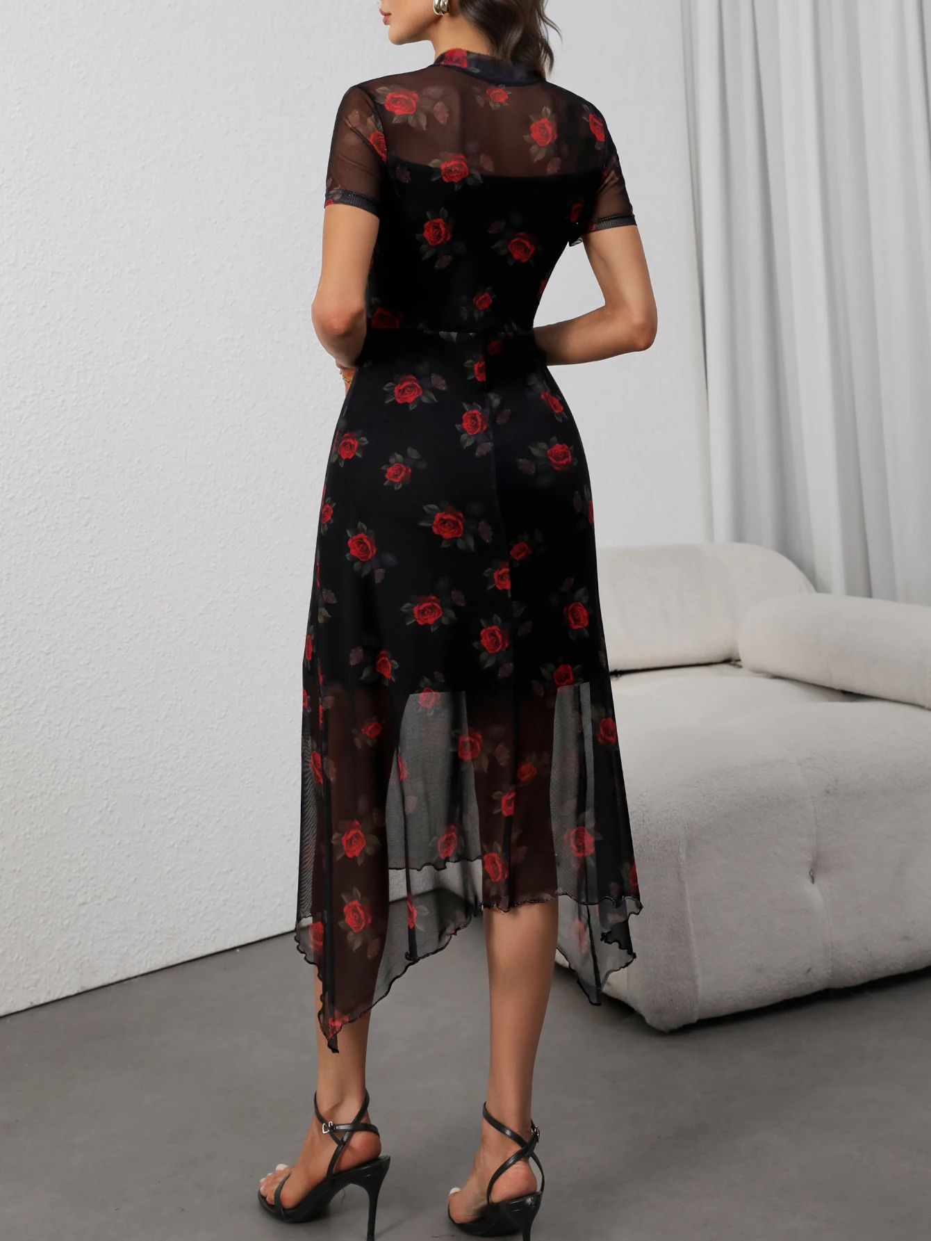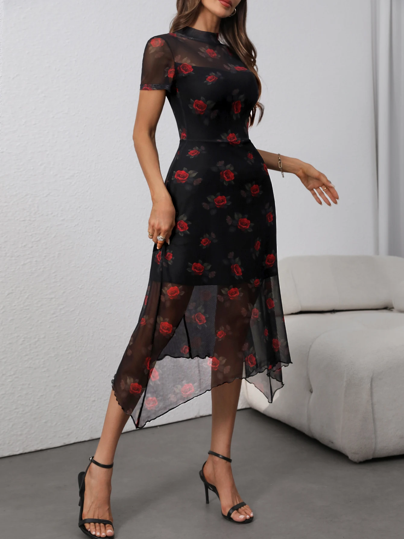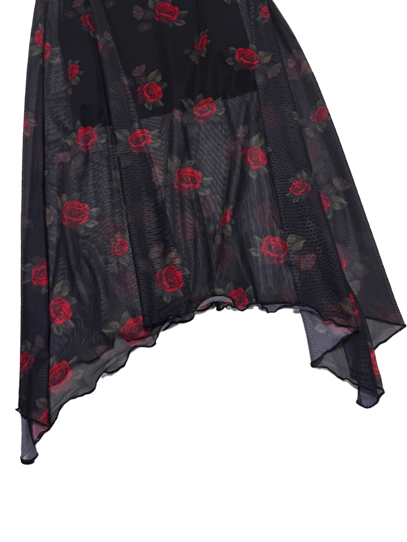 Goth Dark Elegant Fashion Florals Print Short Sleeve Mid Dress Fairy Grunge Mesh Patchwork Double Layer Dresses Gothic Techwear