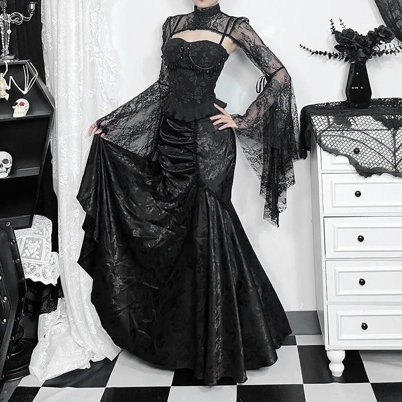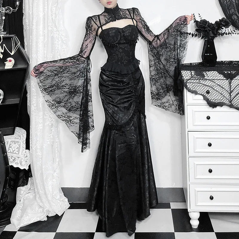 Goth Dark Elegant Fashion Party Gown High Waist Lace Stitch Mermaid Skirt Female Sexy Pleated Bodycon Skirts Gothic Streetwear