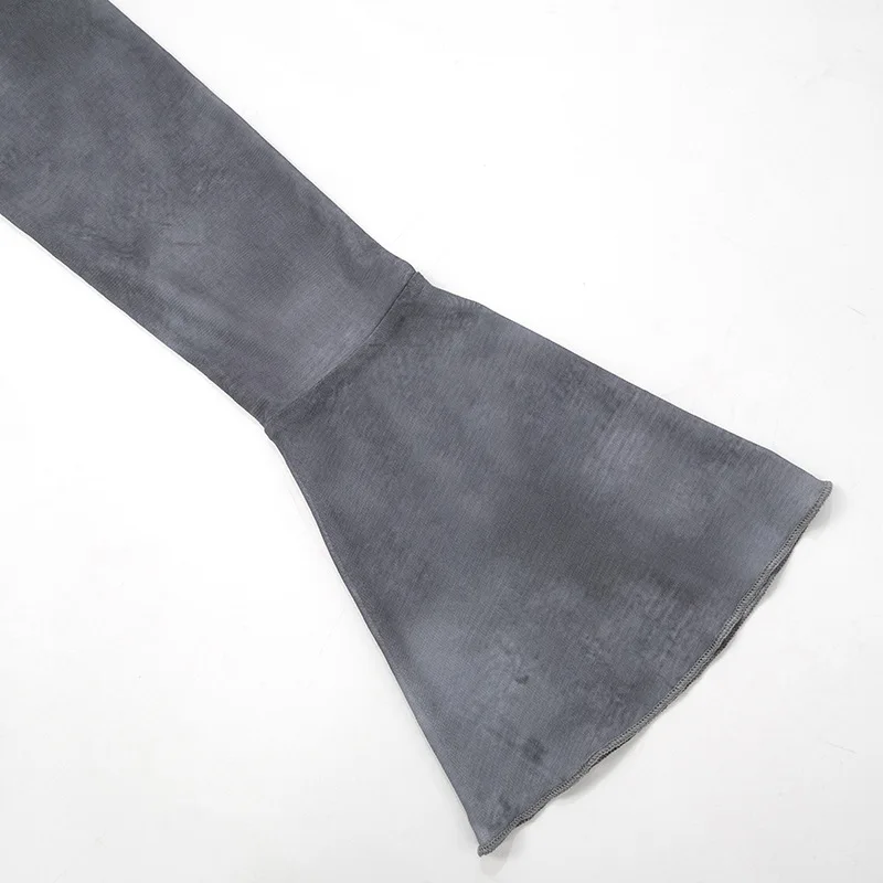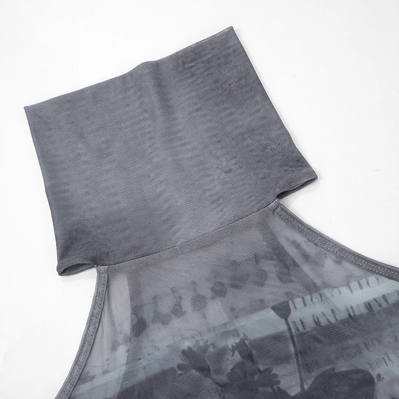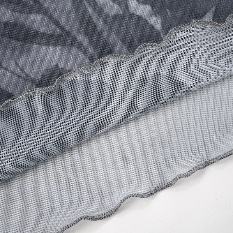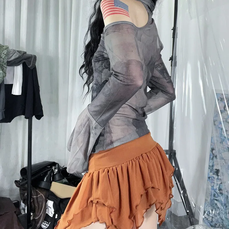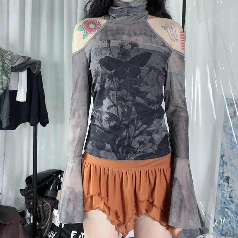 Goth Dark Fairy Grunge Aesthetic Mesh T-shirts Mall Gothic Print Women Y2k Crop Tops Turtleneck Open Shoulder Flare Sleeve Tees