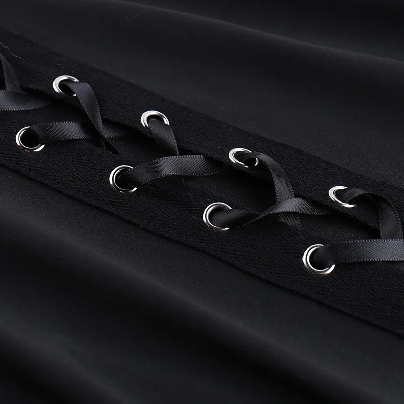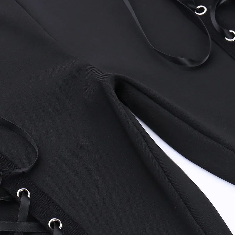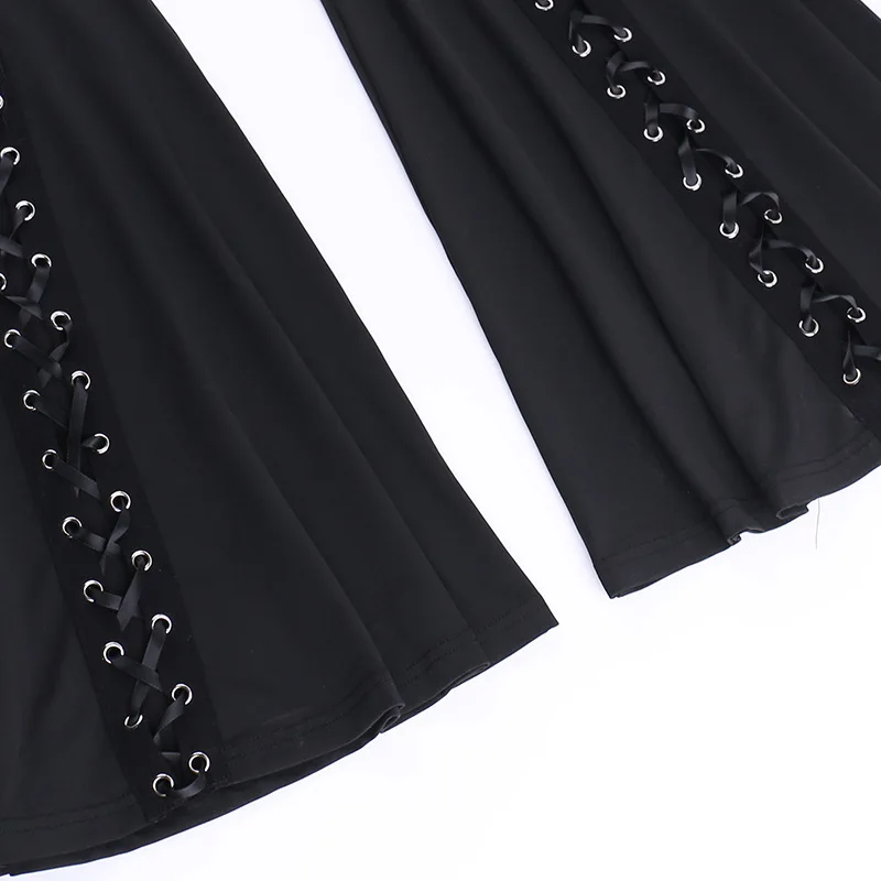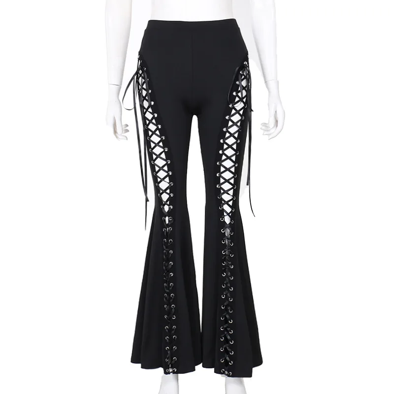 Goth Dark Grunge Streetwear Black Bandage Trousers Cyber Gothic Punk Hollow Out Flare Pants Women Emo High Waist Sexy Alt Bottom