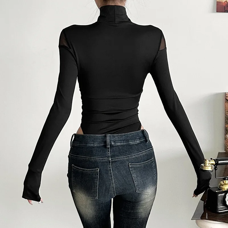 Goth Dark Hollouw Out Long Sleeve Skinny Bodysuit Women Y2K Grunge Mesh Patchwork Playsuits Mall Goth Fashion Street Bodysuits