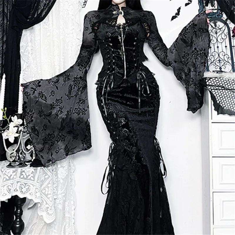 Goth Dark See Through Mesh Flocking Print Crop Shrug Tops Mall Gothic Flare Sleeve Smock Shawl Women Thin Coats Alt Streetwear