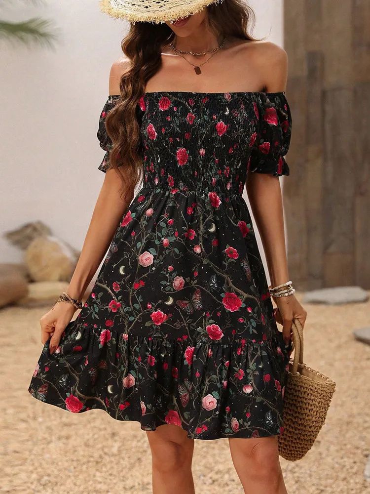 Goth Dark Sweet Rose Print Ladies Holiday Outfits 2000s Aesthetics Pleated Slim Dresses Sexy Off Shoulder Party Dress Gothic Alt