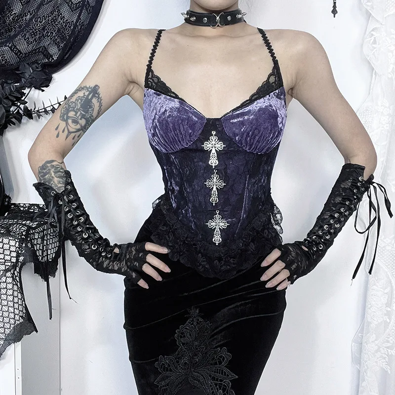 Goth Dark Vintage Fashion Velvet Patchwork Straps Tank Top Fairy Grunge Lace Hem Camis Gothic Coquette Women Crop Vest Techwear