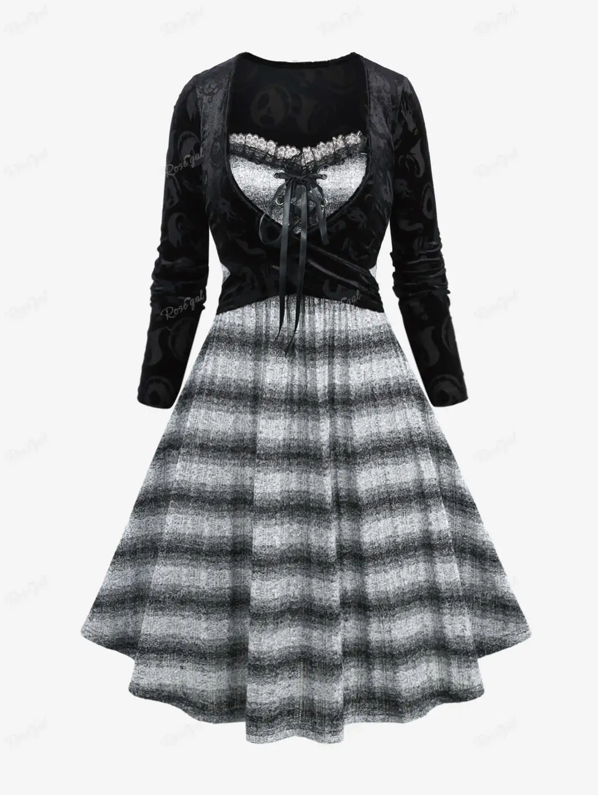 ROSEGAL Plus Size Casual Dresses Skull Pumpkin Print Crossover Lace Up Striped Knitted 2 In 1 Dress Women Going Out Vestidos