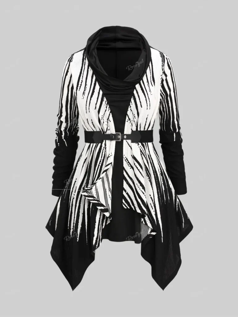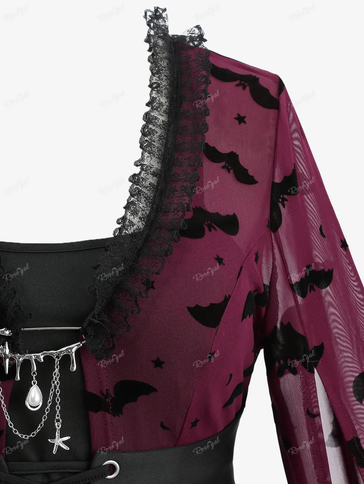 ROSEGAL Plus Size Split Flare Sleeves T-shirt Women Spring Autumn Deep Red Bat Star Mesh Flocking Lace Up Lace-trim Belted Tops