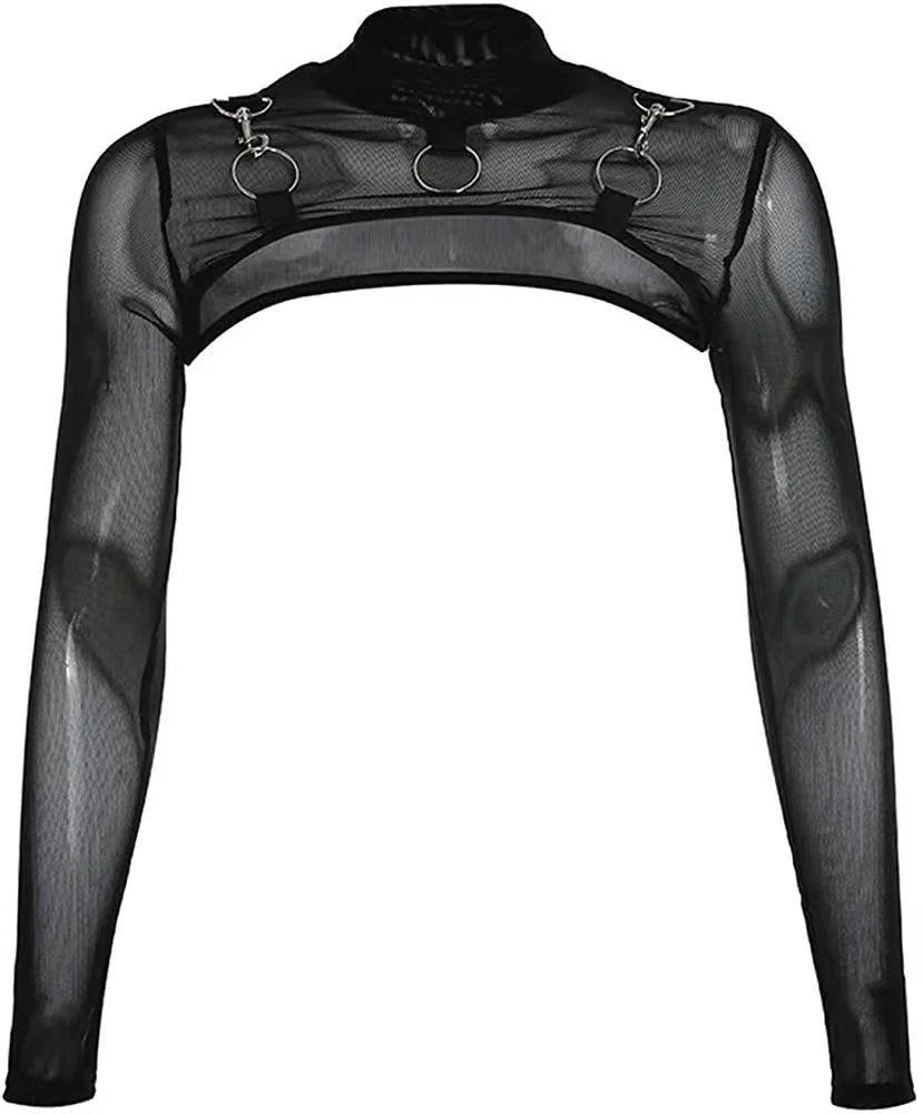 Women's Gothic Mesh See Through Long Sleeve Turtleneck Bolero Shrug Crop Tops Black O-ring Metal Detail