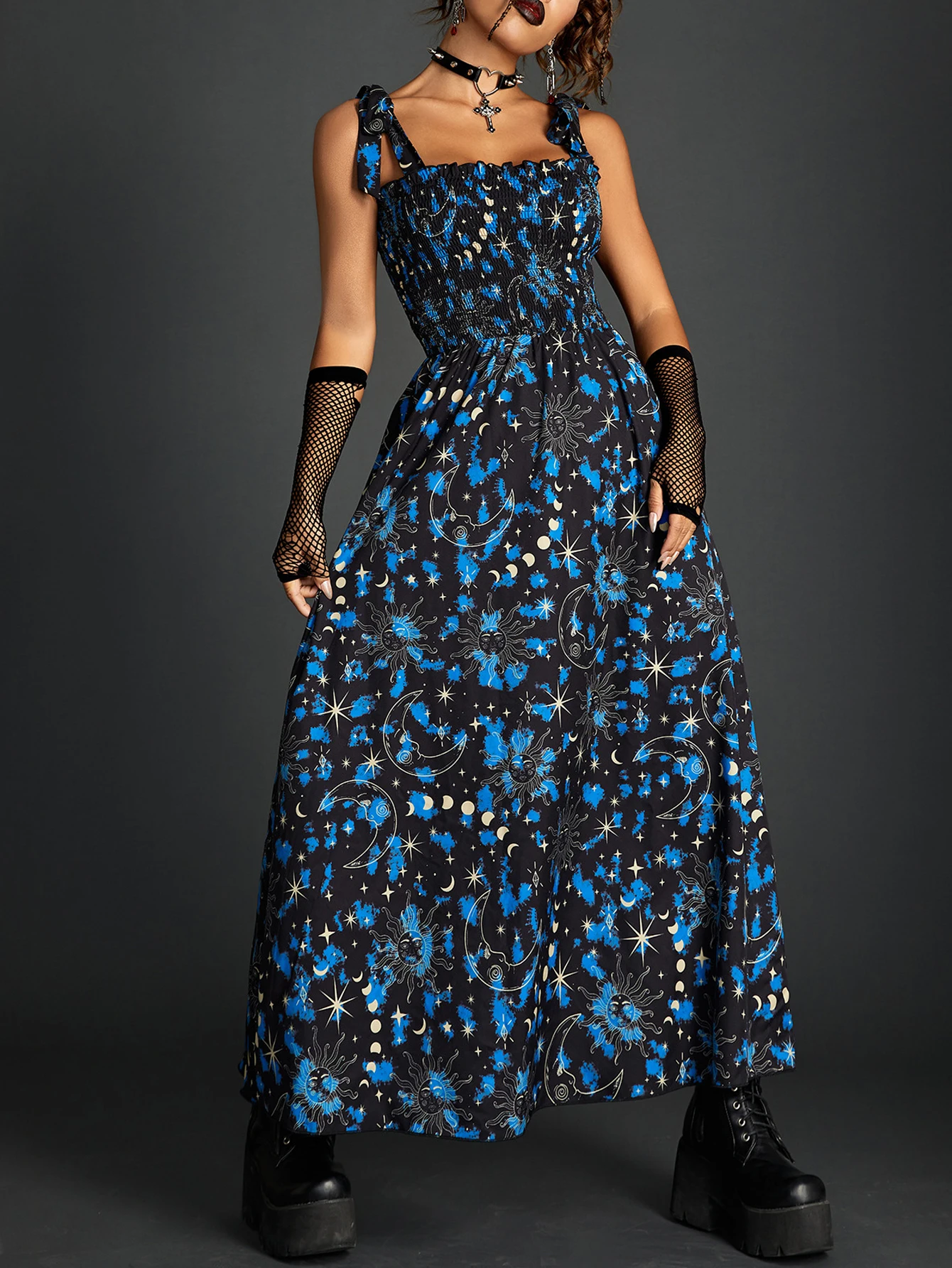 Goth Dark Grunge Streetwear Magic Printed Dresses Mall Gothic Aesthetic Streetwear Partywear Black Women Shirring Slip Alt Dress