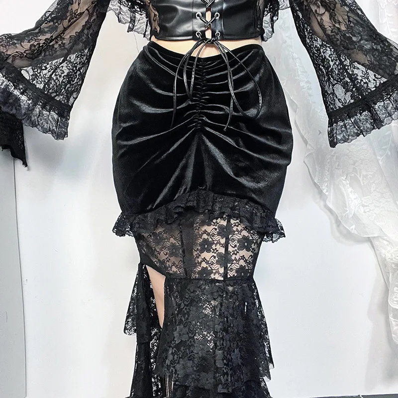 Goth Dark Ruched Vintage Gothic Aesthetic Velvet Skirts Grunge Mesh Splice Sexy Mermaid Skirt Women High Waist Elegant Partywear