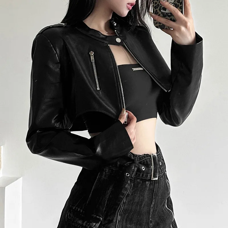 Goth Dark Zipper Cyber Gothic Y2k Crop Jackets Grunge Punk Style Faux Leather Coats Female Fashion Streetwear Irregular Hem Coat