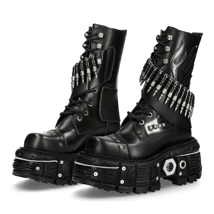 Gothic Punk Platform Combat Boots- Heavy Metal Steampunk Leather Boots with Bullet Chain and Flame Design for Men and Women