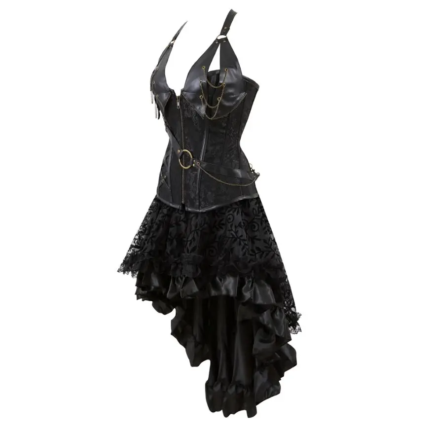 Gothic Leather Corsets Dress Steampunk Pirate Corset Bustier Top With Floral Lace Skirt Set Burlesque Halloween Costume